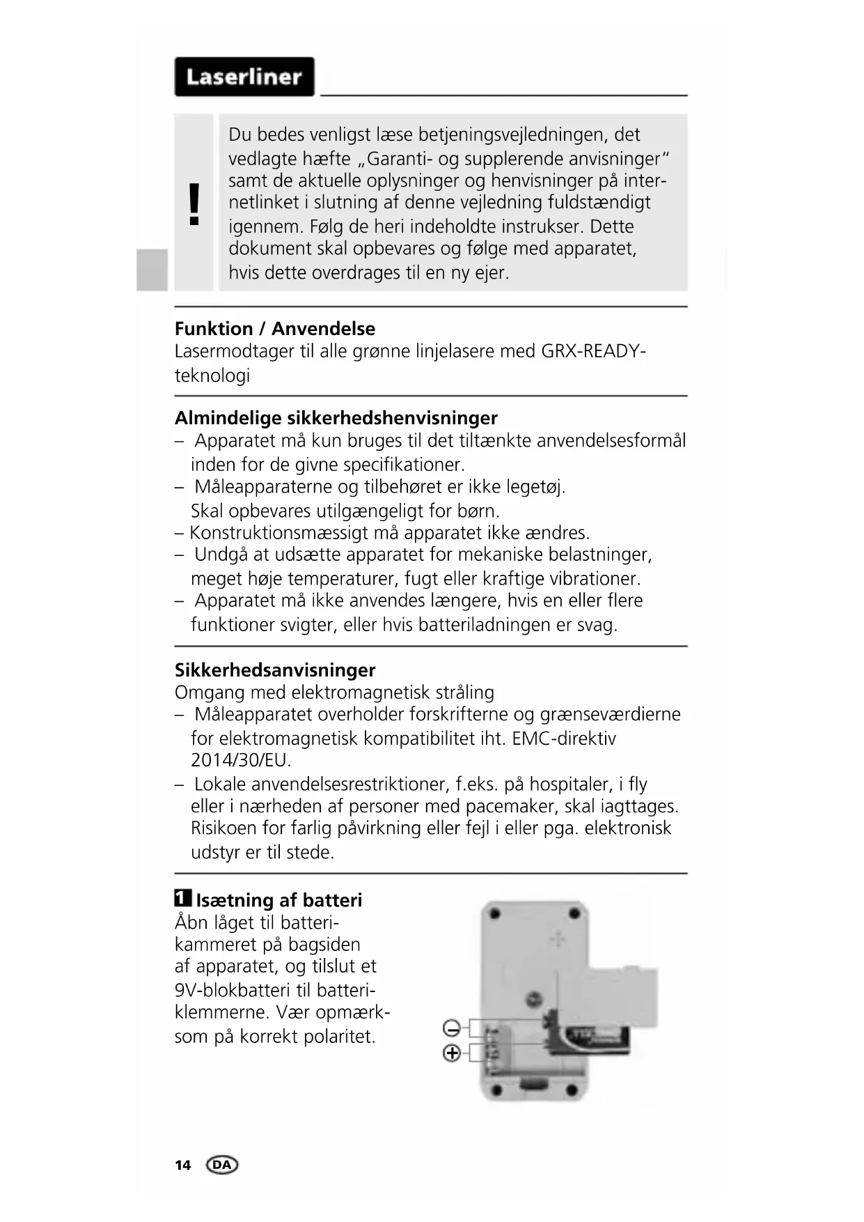 Almindelige sikkerhedshenvisninger – Apparatet må kun bruges til det tiltænkte anvendelsesformål inden for de givne specikationer. – Måleapparaterne og tilbehøret er ikke legetøj. Skal opbevares utilgængeligt for børn. – Konstruktionsmæssigt må apparatet ikke ændres. – Undgå at udsætte apparatet for mekaniske belastninger, meget høje temperaturer, fugt eller kraftige vibrationer. – Apparatet må ikke anvendes længere, hvis en eller ere funktioner svigter, eller hvis batteriladningen er svag. Sikkerhedsanvisninger Omgang med elektromagnetisk stråling – Måleapparatet overholder forskrifterne og grænseværdierne for elektromagnetisk kompatibilitet iht. EMC-direktiv 2014/30/EU. – Lokale anvendelsesrestriktioner, f.eks. på hospitaler, i y eller i nærheden af personer med pacemaker, skal iagttages. Risikoen for farlig påvirkning eller fejl i eller pga. elektronisk udstyr er til stede. DARangeXtender G 30
