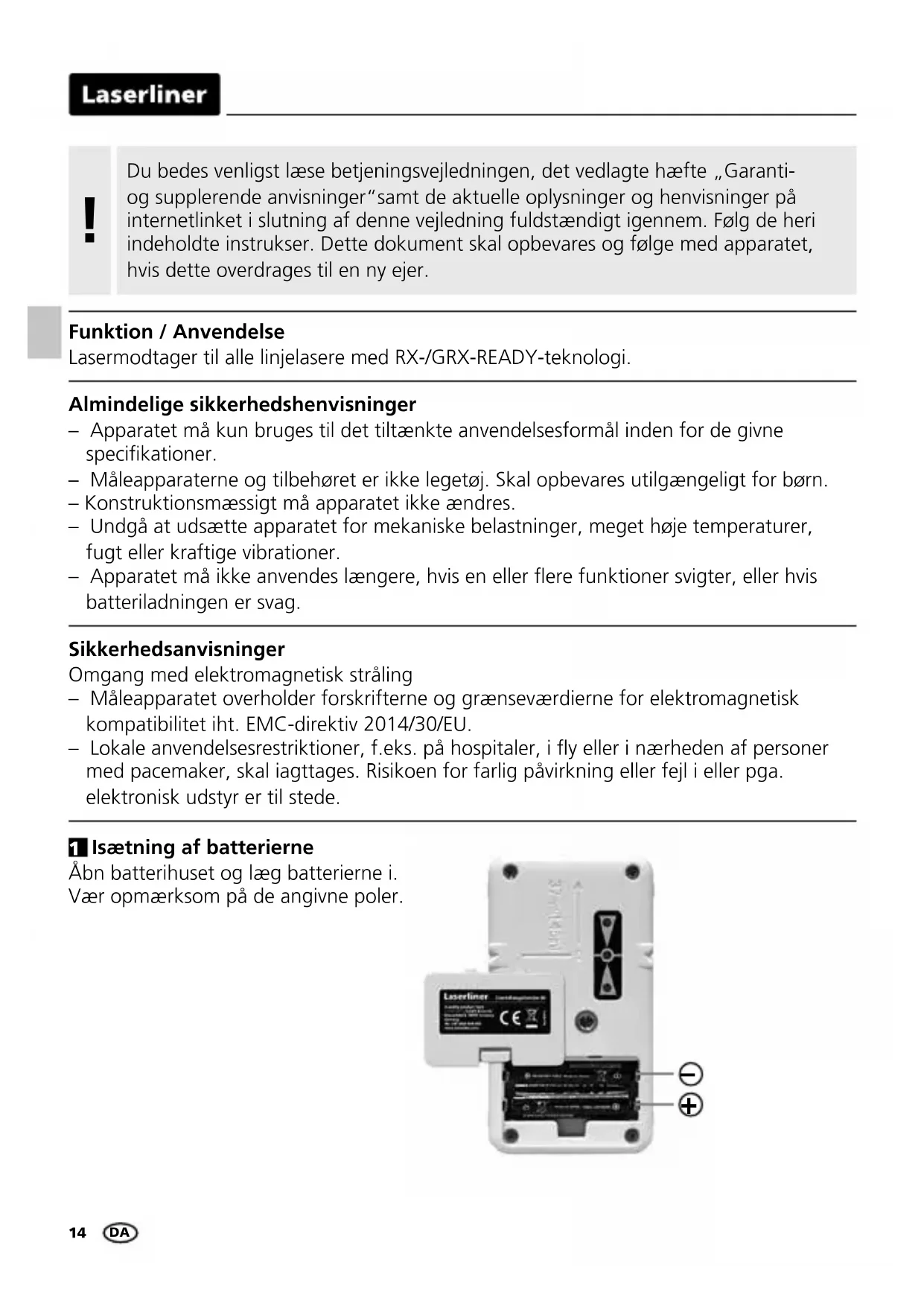 Almindelige sikkerhedshenvisninger – Apparatet må kun bruges til det tiltænkte anvendelsesformål inden for de givne specikationer. – Måleapparaterne og tilbehøret er ikke legetøj. Skal opbevares utilgængeligt for børn. – Konstruktionsmæssigt må apparatet ikke ændres. – Undgå at udsætte apparatet for mekaniske belastninger, meget høje temperaturer, fugt eller kraftige vibrationer. – Apparatet må ikke anvendes længere, hvis en eller ere funktioner svigter, eller hvis batteriladningen er svag. Sikkerhedsanvisninger Omgang med elektromagnetisk stråling – Måleapparatet overholder forskrifterne og grænseværdierne for elektromagnetisk kompatibilitet iht. EMC-direktiv 2014/30/EU. – Lokale anvendelsesrestriktioner, f.eks. på hospitaler, i y eller i nærheden af personer med pacemaker, skal iagttages. Risikoen for farlig påvirkning eller fejl i eller pga. elektronisk udstyr er til stede. Funktion / Anvendelse Lasermodtager til alle linjelasere med RX-/GRX-READY-teknologi. Isætning af batterierne Åbn batterihuset og læg batterierne i. Vær opmærksom på de angivne poler.
