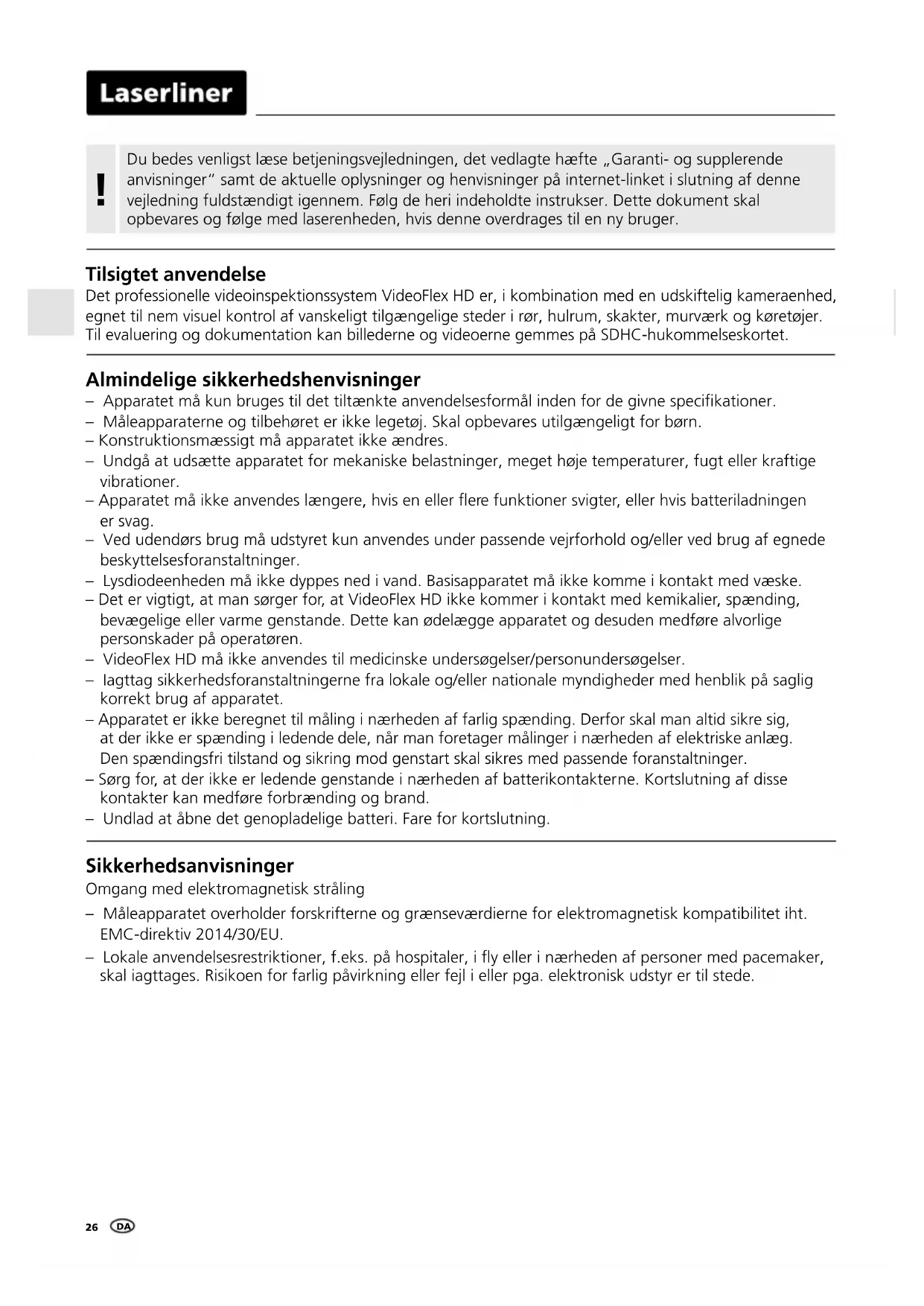 Almindelige sikkerhedshenvisninger – Apparatet må kun bruges til det tiltænkte anvendelsesformål inden for de givne specikationer. – Måleapparaterne og tilbehøret er ikke legetøj. Skal opbevares utilgængeligt for børn. – Konstruktionsmæssigt må apparatet ikke ændres. – Undgå at udsætte apparatet for mekaniske belastninger, meget høje temperaturer, fugt eller kraftige vibrationer. – Apparatet må ikke anvendes længere, hvis en eller ere funktioner svigter, eller hvis batteriladningen er svag. – Ved udendørs brug må udstyret kun anvendes under passende vejrforhold og/eller ved brug af egnede beskyttelsesforanstaltninger. – Lysdiodeenheden må ikke dyppes ned i vand. Basisapparatet må ikke komme i kontakt med væske. – Det er vigtigt, at man sørger for, at VideoFlex HD ikke kommer i kontakt med kemikalier, spænding, bevægelige eller varme genstande. Dette kan ødelægge apparatet og desuden medføre alvorlige personskader på operatøren. – VideoFlex HD må ikke anvendes til medicinske undersøgelser/personundersøgelser. – Iagttag sikkerhedsforanstaltningerne fra lokale og/eller nationale myndigheder med henblik på saglig korrekt brug af apparatet. – Apparatet er ikke beregnet til måling i nærheden af farlig spænding. Derfor skal man altid sikre sig, at der ikke er spænding i ledende dele, når man foretager målinger i nærheden af elektriske anlæg. Den spændingsfri tilstand og sikring mod genstart skal sikres med passende foranstaltninger. – Sørg for, at der ikke er ledende genstande i nærheden af batterikontakterne. Kortslutning af disse kontakter kan medføre forbrænding og brand. – Undlad at åbne det genopladelige batteri. Fare for kortslutning. Sikkerhedsanvisninger Omgang med elektromagnetisk stråling – Måleapparatet overholder forskrifterne og grænseværdierne for elektromagnetisk kompatibilitet iht. EMC-direktiv 2014/30/EU. – Lokale anvendelsesrestriktioner, f.eks. på hospitaler, i y eller i nærheden af personer med pacemaker, skal iagttages. Risikoen for farlig påvirkning eller fejl i eller pga. elektronisk udstyr er til stede. Tilsigtet anvendelse Det professionelle videoinspektionssystem VideoFlex HD er, i kombination med en udskiftelig kameraenhed, egnet til nem visuel kontrol af vanskeligt tilgængelige steder i rør, hulrum, skakter, murværk og køretøjer. Til evaluering og dokumentation kan billederne og videoerne gemmes på SDHC-hukommelseskortet.