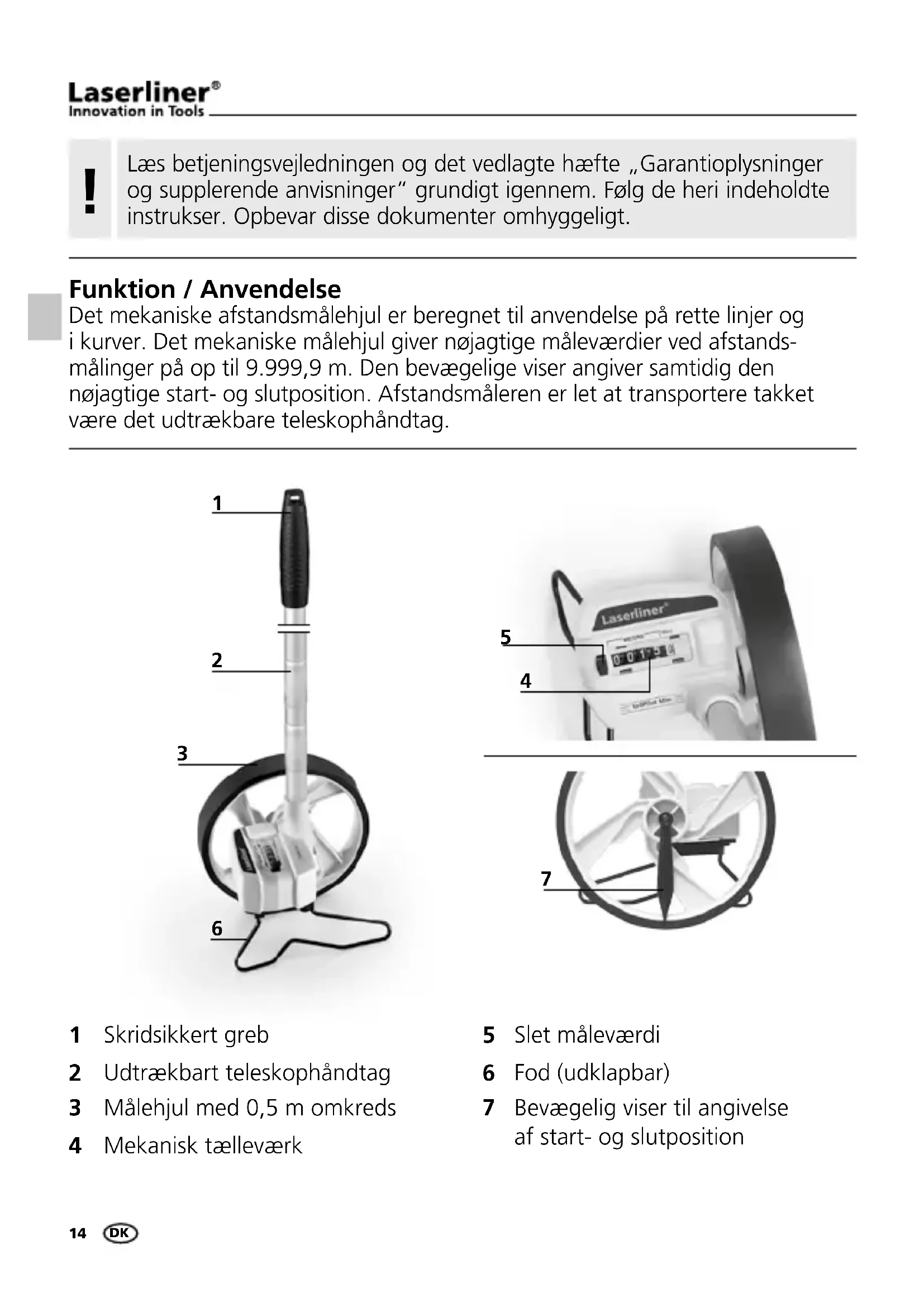 Funktion / Anvendelse Det mekaniske afstandsmålehjul er beregnet til anvendelse på rette linjer og i kurver. Det mekaniske målehjul giver nøjagtige måleværdier ved afstands- målinger på op til 9.999,9 m. Den bevægelige viser angiver samtidig den nøjagtige start- og slutposition. Afstandsmåleren er let at transportere takket være det udtrækbare teleskophåndtag. Skridsikkert greb Udtrækbart teleskophåndtag Målehjul med 0,5 m omkreds Mekanisk tælleværk Slet måleværdi Fod (udklapbar) Bevægelig viser til angivelse af start- og slutposition
