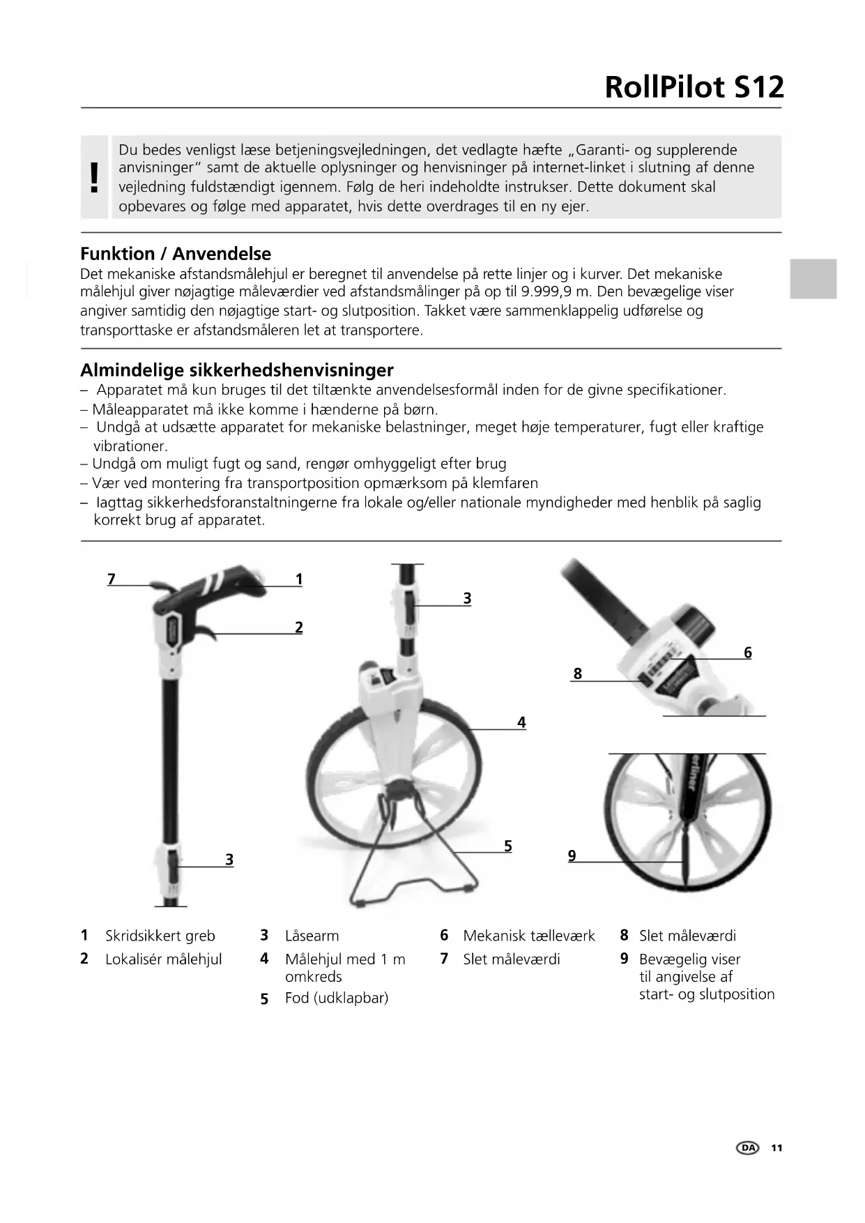 Funktion / Anvendelse Det mekaniske afstandsmålehjul er beregnet til anvendelse på rette linjer og i kurver. Det mekaniske målehjul giver nøjagtige måleværdier ved afstandsmålinger på op til 9.999,9 m. Den bevægelige viser angiver samtidig den nøjagtige start- og slutposition. Takket være sammenklappelig udførelse og transporttaske er afstandsmåleren let at transportere. Almindelige sikkerhedshenvisninger – Apparatet må kun bruges til det tiltænkte anvendelsesformål inden for de givne specikationer. – Måleapparatet må ikke komme i hænderne på børn. – Undgå at udsætte apparatet for mekaniske belastninger, meget høje temperaturer, fugt eller kraftige vibrationer. – Undgå om muligt fugt og sand, rengør omhyggeligt efter brug – Vær ved montering fra transportposition opmærksom på klemfaren – Iagttag sikkerhedsforanstaltningerne fra lokale og/eller nationale myndigheder med henblik på saglig korrekt brug af apparatet.