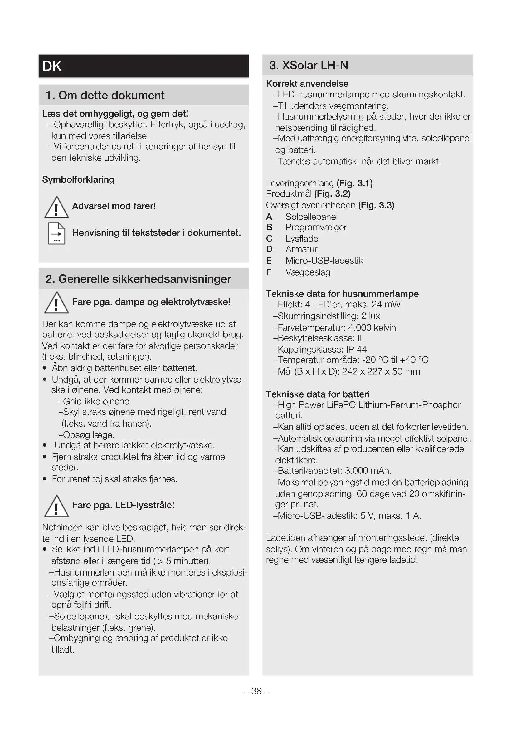 - Se ikke ind i LED-husnummerlampen på kort afstand eller i længere tid ( > 5 minutter). – Husnummerlampen må ikke monteres i eksplosi- onsfarlige områder. – Vælg et monteringssted uden vibrationer for at opnå fejlfri drift. – Solcellepanelet skal beskyttes mod mekaniske belastninger (f.eks. grene). – Ombygning og ændring af produktet er ikke tilladt. 3 XSolar LH-N Korrekt anvendelse – LED-husnummerlampe med skumringskontakt. – Til udendørs vægmontering. – Husnummerbelysning på steder, hvor der ikke er netspænding til rådighed. – Med uafhængig energiforsyning vha. solcellepanel og batteri. – Tændes automatisk, når det bliver mørkt. Leveringsomfang (Fig 31) Produktmål (Fig 32) Oversigt over enheden (Fig 33) A Solcellepanel B Programvælger C Lysflade D Armatur E Micro-USB-ladestik F Vægbeslag Tekniske data for husnummerlampe – Eekt: 4 LED'er, maks. 24 mW – Skumringsindstilling: 2 lux – Farvetemperatur: 4.000 kelvin – Beskyttelsesklasse: III – Kapslingsklasse: IP 44 – Temperatur område: -20 °C til +40 °C – Mål (B x H x D): 242 x 227 x 50 mm Tekniske data for batteri – High Power LiFePO Lithium-Ferrum-Phosphor batteri. – Kan altid oplades, uden at det forkorter levetiden. – Automatisk opladning via meget eektivt solpanel. – Kan udskiftes af producenten eller kvalificerede elektrikere. – Batterikapacitet: 3.000mAh. – Maksimal belysningstid med en batteriopladning uden genopladning: 60 dage ved 20 omskiftnin- ger pr. nat. – Micro-USB-ladestik: 5 V, maks. 1 A. Ladetiden afhænger af monteringsstedet (direkte sollys). Om vinteren og på dage med regn må man regne med væsentligt længere ladetid.– 37 – 4 Montering