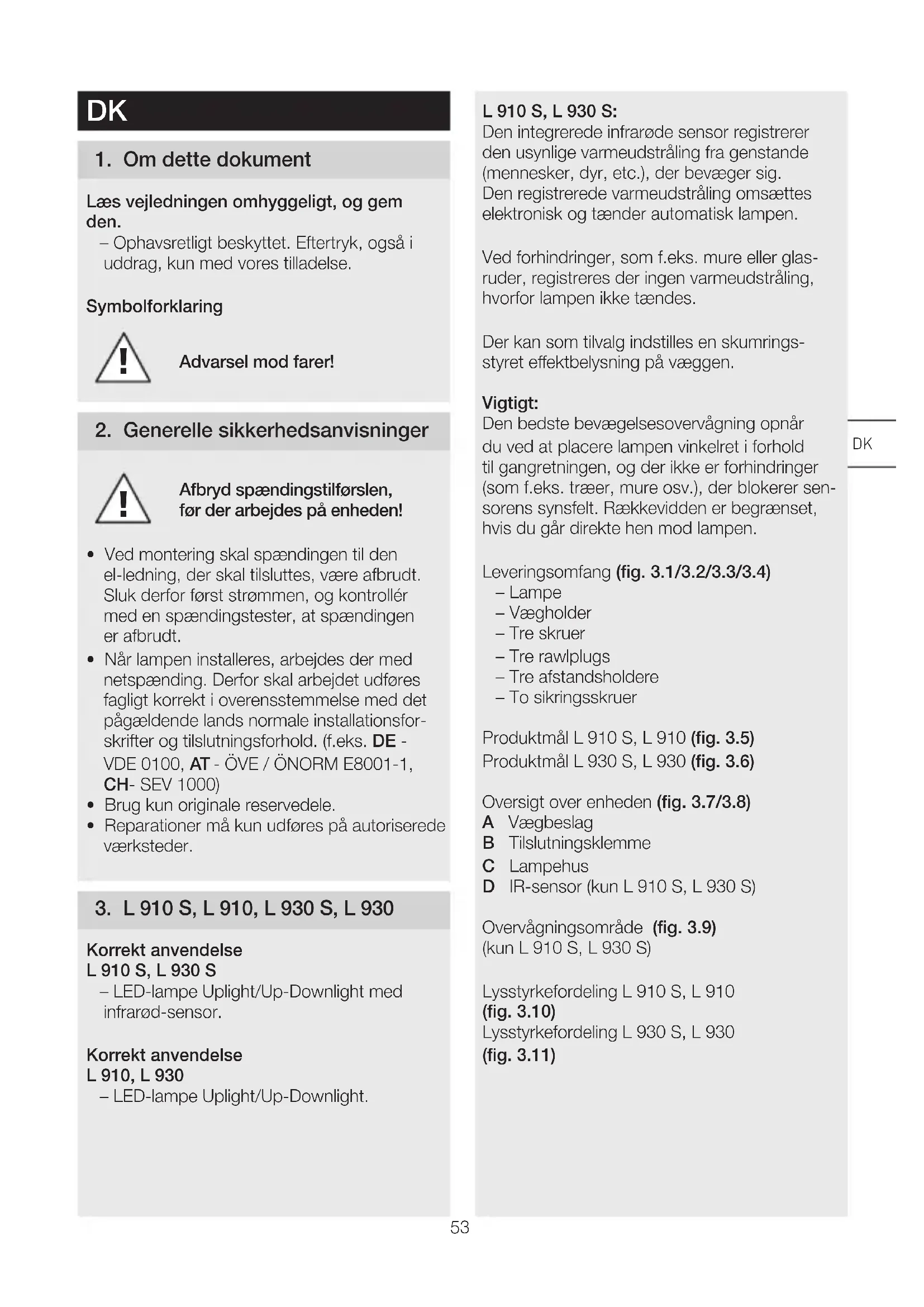 - Reparationer må kun udføres på autoriserede værksteder. 3 L910S, L910, L930S, L930 Korrekt anvendelse L910S, L930S – LED-lampe Uplight/Up-Downlight med infrarød-sensor. Korrekt anvendelse L910, L930 – LED-lampe Uplight/Up-Downlight. L910S, L930S: Den integrerede infrarøde sensor registrerer den usynlige varmeudstråling fra genstande (mennesker, dyr, etc.), der bevæger sig. Den registrerede varmeudstråling omsættes elektronisk og tænder automatisk lampen. Ved forhindringer, som f.eks. mure eller glas- ruder, registreres der ingen varmeudstråling, hvorfor lampen ikke tændes. Der kan som tilvalg indstilles en skumrings- styret eektbelysning på væggen. Vigtigt: Den bedste bevægelsesovervågning opnår du ved at placere lampen vinkelret i forhold til gangretningen, og der ikke er forhindringer (som f.eks. træer, mure osv.), der blokerer sen- sorens synsfelt. Rækkevidden er begrænset, hvis du går direkte hen mod lampen. Leveringsomfang (fig 31/32/33/34) – Lampe – Vægholder – Tre skruer – Tre rawlplugs – Tre afstandsholdere – To sikringsskruer Produktmål L910S, L910 (fig 35) Produktmål L930S, L930 (fig 36) Oversigt over enheden (fig 37/38) A Vægbeslag B Tilslutningsklemme C Lampehus D IR-sensor (kun L910S, L930S) Overvågningsområde (fig 39) (kun L910S, L930S) Lysstyrkefordeling L910S, L910 (fig 310) Lysstyrkefordeling L930S, L930 (fig 311)54 4 Elektrisk tilslutning Ledningsdiagram (fig 41) Netledningen består af en ledning med 3ledere: L = fase (for det meste sort, brun eller grå) N = nulleder (oftest blå) PE = beskyttelsesleder (grøn/gul) K = kommunikationsledning (tilvalg) (kun L910S, L930S) Hvis du er i tvivl, skal du identificere ledninger- ne med en spændingstester og derefter afbry- de spændingen igen. Fase (L) og nulleder (N) tilsluttes tilslutningsklemmen, og jordledningen (PE) tilsluttes klemmen (E) (fig 55/56) Vigtigt: Ombytning af tilslutningerne fører senere til kortslutning i enheden eller i sikringsboksen. Hvis dette sker, skal de enkelte ledninger identificeres og monteres igen. I nettilførslen kan der naturligvis installeres en tænd/sluk- afbryder. Lyskilden i denne lampe kan ikke udskiftes. Hvis lyskilden skal udskiftes (f.eks. når den ikke fungerer længere), skal hele lampen udskiftes Gruppeadfærd Via kommunikationsledningen (K) er det muligt at lave et internt STEINEL-gruppenetværk med L910S, L930S. Dette gør du ved at brække afdækningsfligen ud i tilslutningsrummet (fig42) Der kan maksimalt være 10 lamper i samme netværk. Kommunikationsledningens længde må maksimalt være 50 m. Den første lampe i en gruppe, der registrerer bevægelse, tænder hele gruppen. Hvis der ikke registreres yderligere bevægelser, efter at tidsindstillingen er udløbet, slukker den sidste lampe i en gruppe hele gruppen. Bemærk: – Der må ikke sættes spænding til kommu- nikationsledningen. Der må ikke omskiftes eksterne belastninger! – I gruppenetværket følger alle lamper de værdier, som er indstillet individuelt med DIP-kontakterne. – I testtilstand er gruppenetværk ikke muligt. 5 Montering