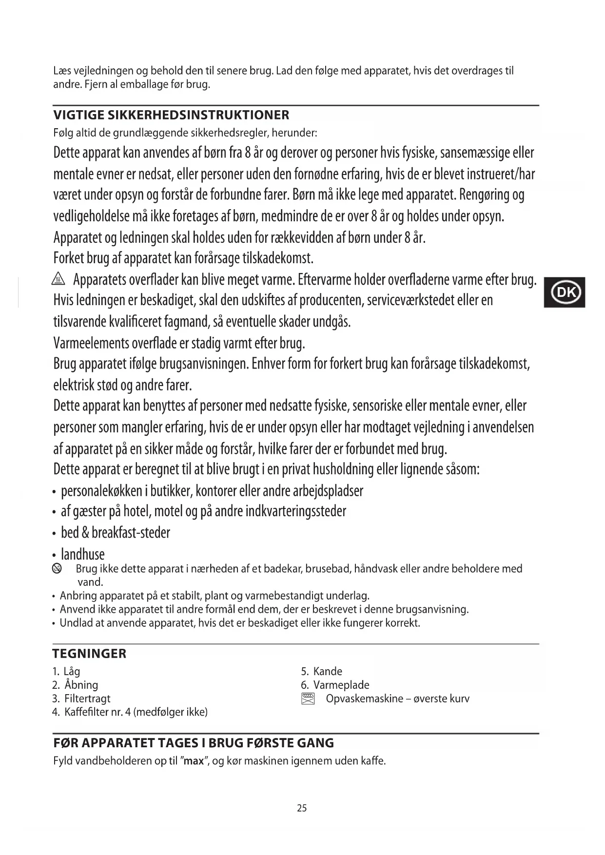 - Undlad at anvende apparatet, hvis det er beskadiget eller ikke fungerer korrekt. TEGNINGER