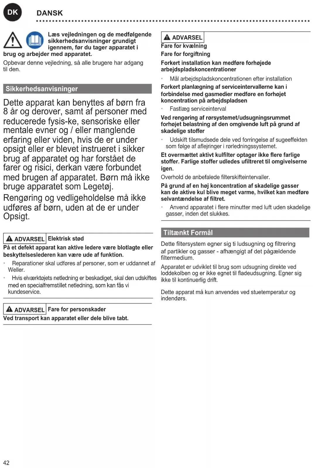- Anvendaldrigapparatetmedtildækkedeellerblokerede ventilationsåbninger ADVARSEL Brand- og eksplosionsfare! Apparatet må ikke anvendes til udsugning af brændbare gasser. Apparatet må ikke udsættes for temperaturer over 50 °C, åben ild eller kondenserede opløsningsmidler. Anlæggets ejer er ansvarlig for, at de ifølge loven tilladte grænseværdier for skadelige stoffer ved arbejdspladsen overholdes. Filtersystemet må kun anvendes, såfremt det er i teknisk fejlfri stand. Bestemmelsesmæssig brug omfatter også, at