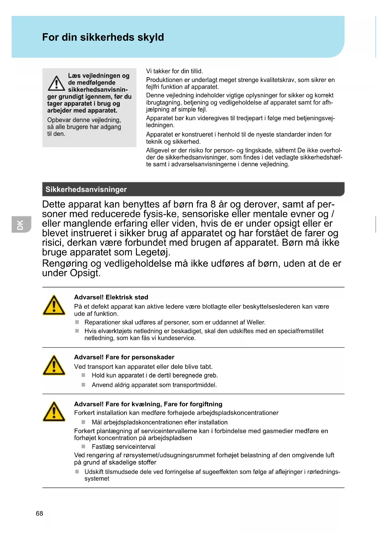 Vi takker for din tillid. Produktionen er underlagt meget strenge kvalitetskrav, som sikrer en fejlfri funktion af apparatet. ennevejledningindeholdervigtigeoplysningerforsikkerogkorrekt ibrugtagning, betjening og vedligeholdelse af apparatet samt for afh- jælpning af simple fejl. Apparatet bør kun videregives til tredjepart i følge med betjeningsvej- ledningen. pparateterkonstrueretihenholdtildenyestestandarderindenfor teknik og sikkerhed. Alligevel er der risiko for person- og tingskade, såfremt De ikke overhol- derdesikkerhedsanvisningersomndesidetvedlagtesikkerhedshf- te samt i advarselsanvisningerne i denne vejledning. For din sikkerheds skyld Læs vejledningen og de medfølgende sikkerhedsanvisnin- ger grundigt igennem, før du tager apparatet i brug og arbejder med apparatet. Opbevar denne vejledning, så alle brugere har adgang til den. Sikkerhedsanvisninger etteapparatkanenyttesafrnfrarogderoversamtafper- sonermedreduceredefysiskesensoriskeellermentaleevnerog eller manglende erfaring eller viden, hvis de er under opsigt eller er blevet instrueret i sikker brug af apparatet og har forstået de farer og risiciderkanvreforundetmedrugenafapparatetrnmikke bruge apparatet som Legetøj. Rengøring og vedligeholdelse må ikke udføres af børn, uden at de er under Opsigt. Advarsel! Elektrisk stød Petdefektapparatkanaktivelederevrelotlagteellereskyttelseslederenkanvre ude af funktion. eparationerskaludfresafpersonersomeruddannetafeller Hvis elværktøjets netledning er beskadiget, skal den udskiftes med en specialfremstillet netledning, som kan fås vi kundeservice. Advarsel! Fare for personskader Ved transport kan apparatet eller dele blive tabt. Hold kun apparatet i de dertil beregnede greb. Anvend aldrig apparatet som transportmiddel. Advarsel! Fare for kvælning, Fare for forgiftning Forkert installation kan medføre forhøjede arbejdspladskoncentrationer Mål arbejdspladskoncentrationen efter installation Forkert planlægning af serviceintervallerne kan i forbindelse med gasmedier medføre en forhøjet koncentration på arbejdspladsen Fastlæg serviceinterval edrengringafrrsystemetudsugningsrummetforhjetelastningafdenomgivendeluft på grund af skadelige stoffer dskifttilsmudsededelevedforringelseafsugeeffektensomflgeafaejringerirrlednings- systemet69