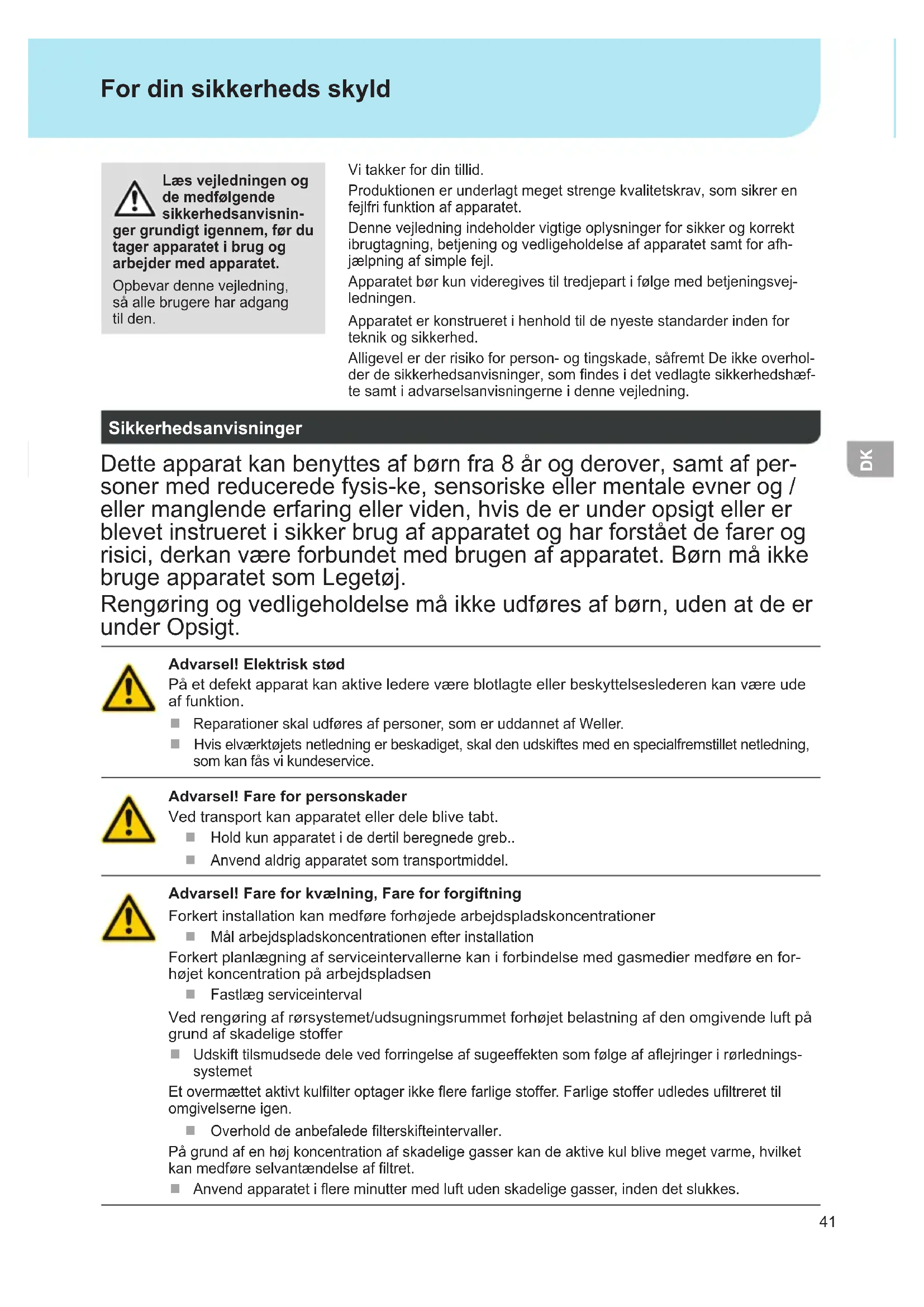 Vi takker for din tillid. Produktionenerunderlagtmegetstrengekvalitetskrav,somsikreren fejlfri funktion af apparatet. Dennevejledningindeholdervigtigeoplysningerforsikkerogkorrekt ibrugtagning,betjeningogvedligeholdelseafapparatetsamtforafh- jælpning af simple fejl. Apparatet bør kun videregives til tredjepart i følge med betjeningsvej- ledningen. Apparateterkonstrueretihenholdtildenyestestandarderindenfor teknik og sikkerhed. Alligevelerderrisikoforperson-ogtingskade,såfremtDeikkeoverhol- derdesikkerhedsanvisninger,somndesidetvedlagtesikkerhedshæf- te samt i advarselsanvisningerne i denne vejledning. For din sikkerheds skyld Læs vejledningen og de medfølgende sikkerhedsanvisnin- ger grundigt igennem, før du tager apparatet i brug og arbejder med apparatet. Opbevardennevejledning, så alle brugere har adgang til den. Sikkerhedsanvisninger Detteapparatkanbenyttesafbørnfra8årogderover,samtafper- sonermedreduceredefysis-ke,sensoriskeellermentaleevnerog/ ellermanglendeerfaringellerviden,hvisdeerunderopsigtellerer blevet instrueret i sikker brug af apparatet og har forstået de farer og risici,derkanværeforbundetmedbrugenafapparatet.Børnmåikke bruge apparatet som Legetøj. Rengøringogvedligeholdelsemåikkeudføresafbørn,udenatdeer under Opsigt. Advarsel! Elektrisk stød Påetdefektapparatkanaktiveledereværeblotlagteellerbeskyttelseslederenkanværeude af funktion. Reparationerskaludføresafpersoner,someruddannetafWeller. Hviselværktøjetsnetledningerbeskadiget,skaldenudskiftesmedenspecialfremstilletnetledning, som kan fås vi kundeservice. Advarsel! Fare for personskader Ved transport kan apparatet eller dele blive tabt. Hold kun apparatet i de dertil beregnede greb.. Anvend aldrig apparatet som transportmiddel. Advarsel! Fare for kvælning, Fare for forgiftning Forkert installation kan medføre forhøjede arbejdspladskoncentrationer Mål arbejdspladskoncentrationen efter installation Forkert planlægning af serviceintervallerne kan i forbindelse med gasmedier medføre en for- højet koncentration på arbejdspladsen Fastlæg serviceinterval Vedrengøringafrørsystemet/udsugningsrummetforhøjetbelastningafdenomgivendeluftpå grund af skadelige stoffer Udskifttilsmudsededelevedforringelseafsugeeffektensomfølgeafaejringerirørlednings- systemet Etovermættetaktivtkullteroptagerikkeerefarligestoffer. Farligestofferudledesultrerettil omgivelserne igen. Overholddeanbefaledelterskifteintervaller. Pågrundafenhøjkoncentrationafskadeligegasserkandeaktivekulblivemegetvarme,hvilket kanmedføreselvantændelseafltret. Anvendapparatetiereminuttermedluftudenskadeligegasser,indendetslukkes.42