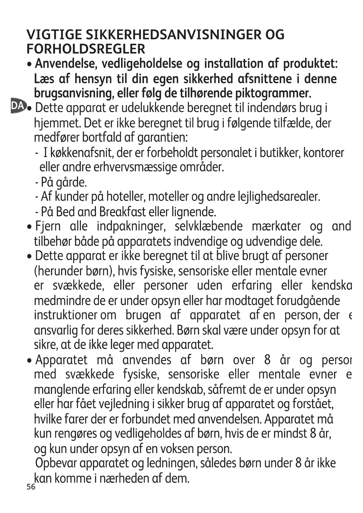 - Detteapparaterikkeberegnettilatblivebrugtafpersoner (herunderbørn),hvisfysiske,sensoriskeellermentaleevner er svækkede, eller personer uden erfaring eller kendskab, medmindredeerunderopsynellerharmodtagetforudgående instruktionerom brugen af apparatet afen person,der er ansvarligforderessikkerhed.Børnskalværeunderopsynforat sikre,atdeikkelegermedapparatet.