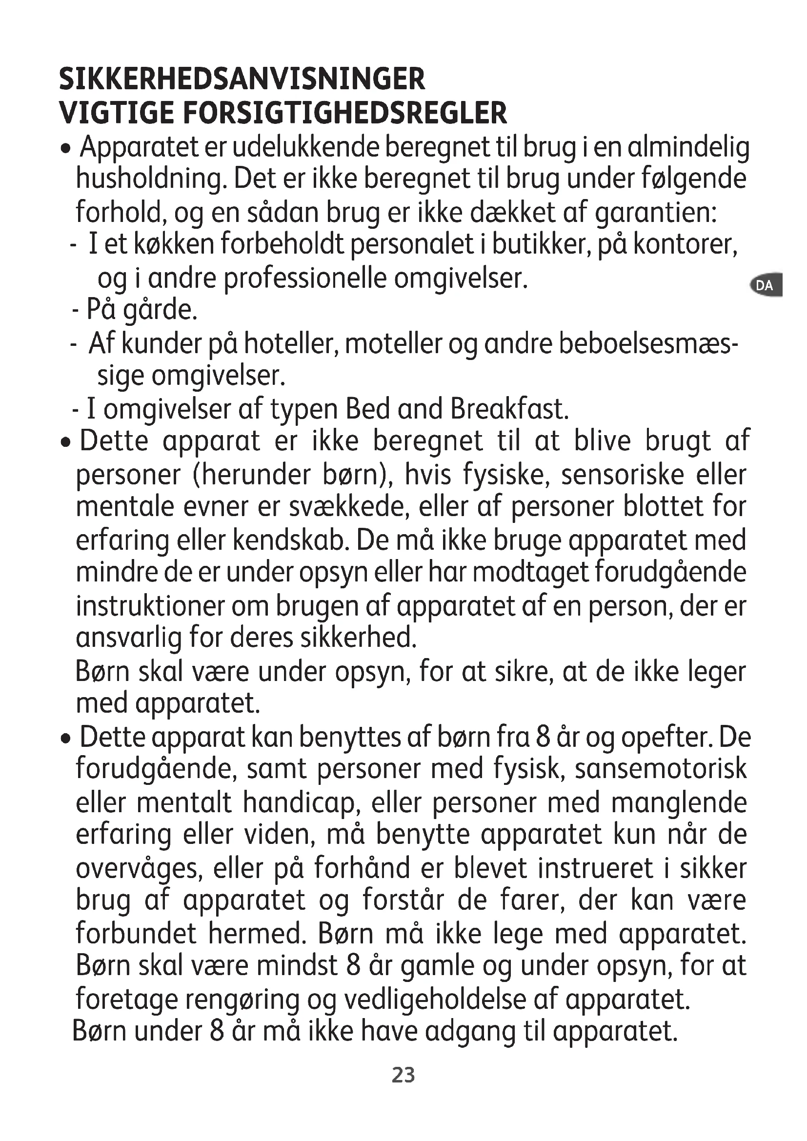 - Dette apparat kan benyttes af børn fra 8 år og opefter. De forudgående, samt personer med fysisk, sansemotorisk eller mentalt handicap, eller personer med manglende erfaring eller viden, må benytte apparatet kun når de overvåges, eller på forhånd er blevet instrueret i sikker brug af apparatet og forstår de farer, der kan være forbundet hermed. Børn må ikke lege med apparatet. Børn skal være mindst 8 år gamle og under opsyn, for at foretage rengøring og vedligeholdelse af apparatet. Børn under 8 år må ikke have adgang til apparatet.