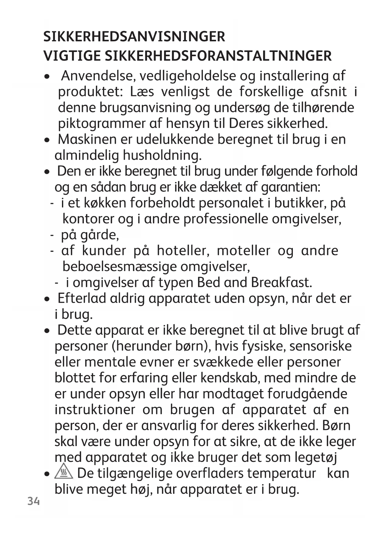 - Den er ikke beregnet til brug under følgende forhold og en sådan brug er ikke dækket af garantien: - i et køkken forbeholdt personalet i butikker, på kontorer og i andre professionelle omgivelser, - på gårde, - af kunder på hoteller, moteller og andre beboelsesmæssige omgivelser,