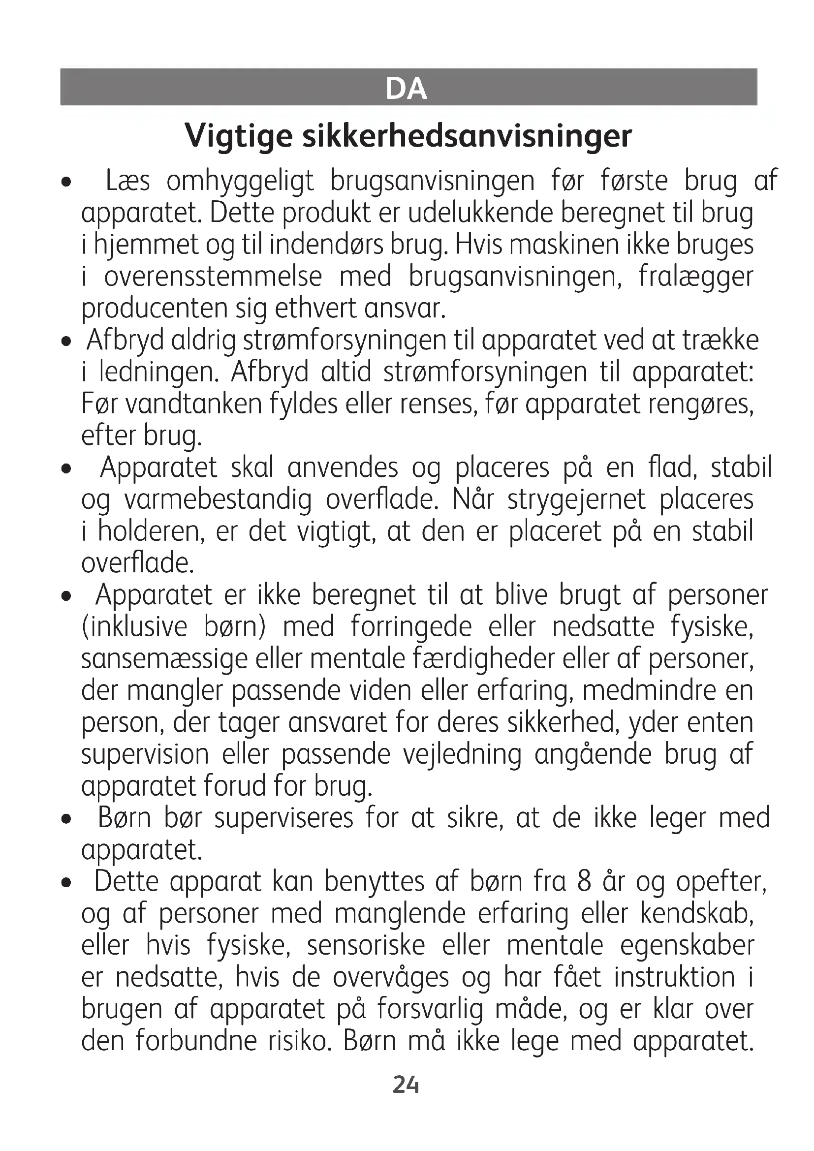 - Dette apparat kan benyttes af børn fra 8 år og opefter, og af personer med manglende erfaring eller kendskab, eller hvis fysiske, sensoriske eller mentale egenskaber er nedsatte, hvis de overvåges og har fået instruktion i brugen af apparatet på forsvarlig måde, og er klar over den forbundne risiko. Børn må ikke lege med apparatet. 24Rengøring og vedligeholdelse må ikke udføres af børn, hvis de ikke er under opsyn. Hold strygejernet og det tilhørende kabel væk fra børn under 8 år, når det varmer op eller køler af.