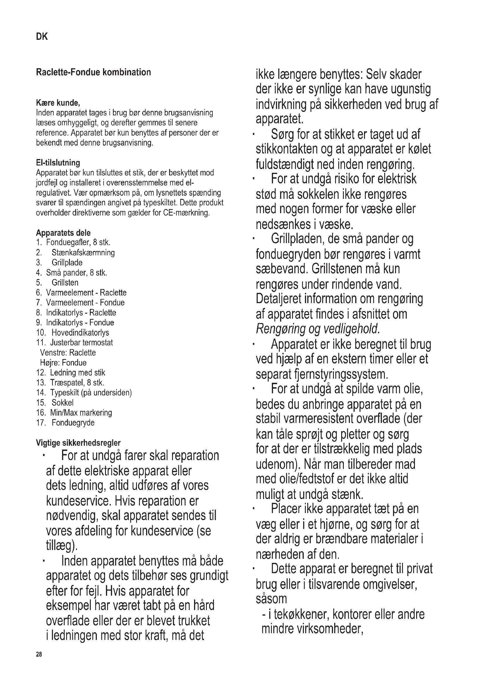 Vigtige sikkerhedsregler ∙ For at undgå farer skal reparation af dette elektriske apparat eller dets ledning, altid udføres af vores kundeservice. Hvis reparation er nødvendig, skal apparatet sendes til vores afdeling for kundeservice (se tillæg). ∙ Inden apparatet benyttes må både apparatet og dets tilbehør ses grundigt efter for fejl. Hvis apparatet for eksempel har været tabt på en hård overade eller der er blevet trukket i ledningen med stor kraft, må det ikke længere benyttes: Selv skader der ikke er synlige kan have ugunstig indvirkning på sikkerheden ved brug af apparatet. ∙ Sørg for at stikket er taget ud af stikkontakten og at apparatet er kølet fuldstændigt ned inden rengøring. ∙ For at undgå risiko for elektrisk stød må sokkelen ikke rengøres med nogen former for væske eller nedsænkes i væske. ∙ Grillpladen, de små pander og fonduegryden bør rengøres i varmt sæbevand. Grillstenen må kun rengøres under rindende vand. Detaljeret information om rengøring af apparatet ndes i afsnittet om Rengøring og vedligehold. ∙ Apparatet er ikke beregnet til brug ved hjælp af en ekstern timer eller et separat fjernstyringssystem. ∙ For at undgå at spilde varm olie, bedes du anbringe apparatet på en stabil varmeresistent overade (der kan tåle sprøjt og pletter og sørg for at der er tilstrækkelig med plads udenom). Når man tilbereder mad med olie/fedtstof er det ikke altid muligt at undgå stænk. ∙ Placer ikke apparatet tæt på en væg eller i et hjørne, og sørg for at der aldrig er brændbare materialer i nærheden af den. ∙ Dette apparat er beregnet til privat brug eller i tilsvarende omgivelser, såsom - i tekøkkener, kontorer eller andre mindre virksomheder, DK29 142 x 208 mm - landbrugsvirksomheder, - af kunder på hoteller, moteller m.m. og tilsvarende foretagender, - B&B pensionater. ∙ Børn under 8 år må ikke betjene dette apparat. ∙ Børn over 8 år må imidlertid godt betjene apparatet, såfremt de er under konstant opsyn af en voksen. ∙ Apparatet må ikke benyttes af personer med reducerede fysiske, sensoriske eller mentale evner, eller mangel på erfaring eller viden, medmindre de har fået vejledning og instruktion i brugen af dette apparat og fuldt ud forstår alle farer og forholdsregler vedrørende sikkerheden som brug af apparatet medfører. ∙ Børn må aldrig få lov til at lege med apparatet. ∙ Børn må aldrig få lov til at udføre nogen former for rengøring eller vedligehold af dette apparat. ∙ Apparatet og dets ledning må altid holdes væk fra børn som er yngre en 8 år. ∙ Advarsel: Hold børn væk fra emballeringen, da denne udgør en mulig risiko for tilskadekomst, ved f.eks. kvælning. ∙ Apparatets overader og tilbehørsdele bliver varme under brug og vil forblive varme i et stykke tid bagefter. Advarsel: Risiko for forbrænding. ∙ Apparatet må kun tændes når grillpladen er korrekt sat på, og enten grillstenen eller den fyldte fonduegryde er placeret på varmepladen. ∙ Brug aldrig dybfrosne fødevarer til grilling eller fondue, de må først tøs op og om nødvendigt dubbes tørre. ∙ Placer aldrig dybfrosne fødevarer eller mad der indeholder eddike (såsom syltede agurker eller sennep) på grillstenen. ∙ Grillstenen er fremstillet af naturmateriale. Mindre revner, der opstår som følge af stenens udvidelse og sammentrækning under opvarmning og afkøling, og gradvis ændring til en mørkere farve, er helt normalt og uden betydning for stenens funktion. ∙ For ikke at beskadige belægningen på grillpladen og de små pander, bør man altid benytte køkkenredskaber der ikke er skarpe, når maden tages af. ∙ Olie/fedtstof kan antændes ved overophedning. I så fald, tag stikket ud af kontakten og sluk ilden ved at tildække gryden med et låg eller lignende. ∙ Hæld aldrig vand på varm eller brændende olie/fedt! ∙ Advarsel: Flyt aldrig apparatet, når den er varm, f.eks. under eller umiddelbart efter brug (på grund af risikoen for at snuble). Pas meget på: Varm olie/fedt kan forårsage alvorlige forbrændinger. ∙ Benyt kun fonduegryden sammen med den tilhørende varmeplade. ∙ Tag altid stikket ud af stikkontakten - efter brug, - i tilfælde af fejlfunktion, - når apparatet ikke er under opsyn, - inden rengøring af apparatet. ∙ Træk aldrig i selve ledningen, når ledningen tages ud af stikkontakten; tag altid fat i selve stikket. ∙ Vi påtager os intet ansvar for skader, som skyldes misbrug eller manglende overholdelse af denne brugsanvisning. Betjening Før brug ∙ Fjern al emballage og mærkater fuldstændigt fra apparatet. ∙ Inden apparatet tages i brug første gang, må alle de forskellige dele tørres af med en fugtig klud. ∙ Apparatet med de små pander, grillpladen og grillstenen påsat varmes op i ca. 10 min., uden nogen fødevarer, for at fjerne den lugt der typisk opstår når en grill tændes første gang (en smule røg kan også forekomme). Af den grund bør man sørge for tilstrækkelig udluftning ved at åbne vinduer eller yderdøre. ∙ Rengør derefter apparatet og alle de forskellige dele som beskrevet i Rengøring og vedligehold. Enkeltvis justerbare varmeelementer med indikatorlys ∙ Apparatet har to varmeelementer, som kan indstilles enkeltvis. ∙ Den venstre termostatknap styrer raclettevarmen, og den højre styrer fonduevarmen. ∙ Temperaturindikatorlysene viser varmeelementernes aktuelle status: Varmeelementet er tændt = indikatorlyset er tændt Varmeelementet er slukket = indikatorlyset er slukket Under betjeningen vil varmeelementerne automatisk tænde og slukke for at styre temperaturen. Hovedindikatorlys Hovedindikatorlyset forbliver tændt så længe apparatet er tilsluttet til stikkontakten.30 142 x 208 mm Betjening Raclette og grill ∙ Placer grillpladen – med den runde fedtopsamlingsrille langs kanten opad – midt på sokkelen. ∙ Placer grillstenen midt på grillpladen med den glatte side op. ∙ Sæt stikket i