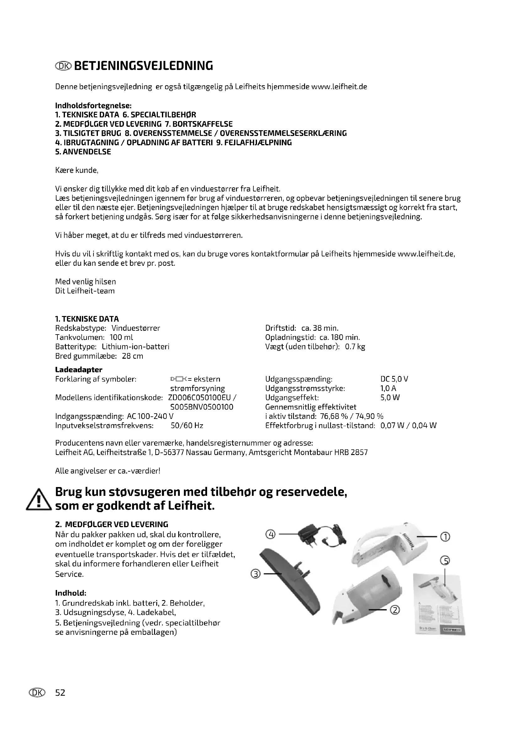 Redskabstype: Vinduestørrer Tankvolumen: 100 ml Batteritype: Lithium-ion-batteri Bred gummilæbe: 28 cm Driftstid: ca. 38 min. Opladningstid: ca. 180 min. Vægt (uden tilbehør): 0.7 kg Producentens navn eller varemærke, handelsregisternummer og adresse: Leifheit AG, Leifheitstraße 1, D-56377 Nassau Germany, Amtsgericht Montabaur HRB 2857 Alle angivelser er ca.-værdier! Brug kun støvsugeren med tilbehør og reservedele, som er godkendt af Leifheit. Ladeadapter Forklaring af symboler: = ekstern strømforsyning Modellens identifikationskode: ZD006C050100EU / S005BNV0500100 Indgangsspænding: AC 100-240 V Inputvekselstrømsfrekvens: 50/60 Hz Udgangsspænding: DC 5,0 V Udgangsstrømsstyrke: 1,0 A Udgangseffekt: 5,0 W Gennemsnitlig effektivitet i aktiv tilstand: 76,68 % / 74,90 % Effektforbrug i nullast-tilstand: 0,07 W / 0,04 W53