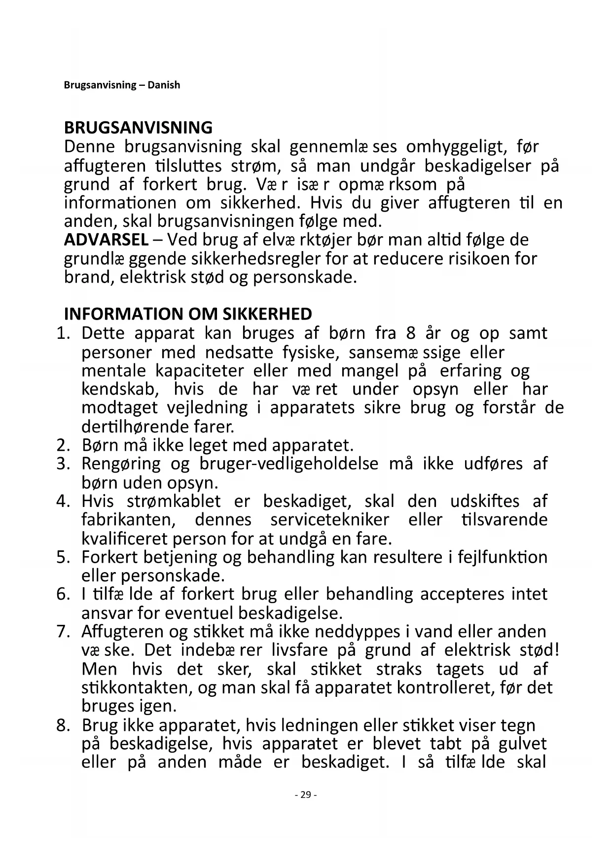 på beskadigelse, hvis apparatet er blevet tabt på gulvet eller på anden måde er beskadiget. I så tilfæ lde skal- 30 - apparatet tages med til en autoriseret el-installatør, som kan kontrollere og om nødvendigt reparere det.