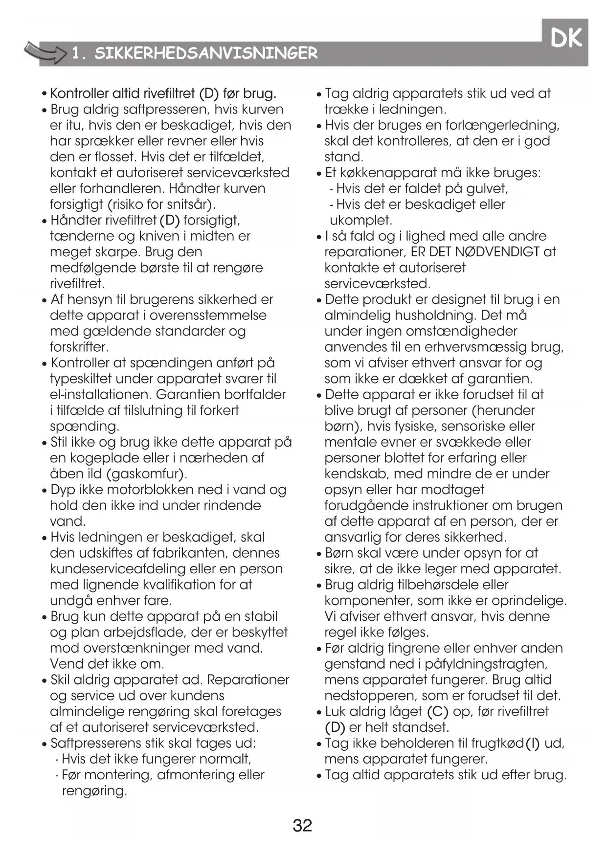 Rengøringsbørste Dette apparat er udstyret med et eksklusivt sikkerhedssystem. Man kan ikke starte saftpresseren, før låget (C)