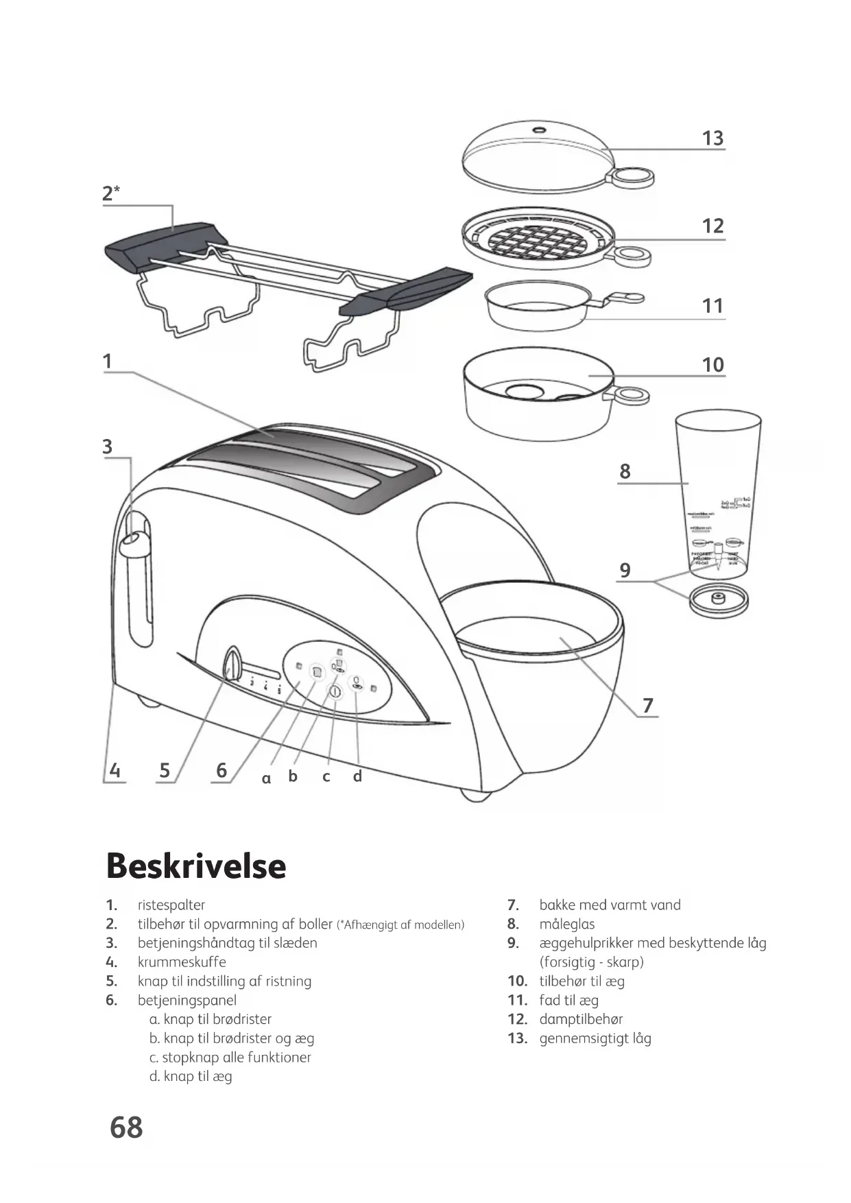 TOASTN'EGG-NC00013044:Mise en page 1 16/10/09 10:38 Page 67Beskrivelse ristespalter tilbehør til opvarmning af boller (*Afhængigt af modellen) betjeningshåndtag til slæden krummeskuffe knap til indstilling af ristning betjeningspanel a. knap til brødrister b. knap til brødrister og æg c. stopknap alle funktioner d. knap til æg