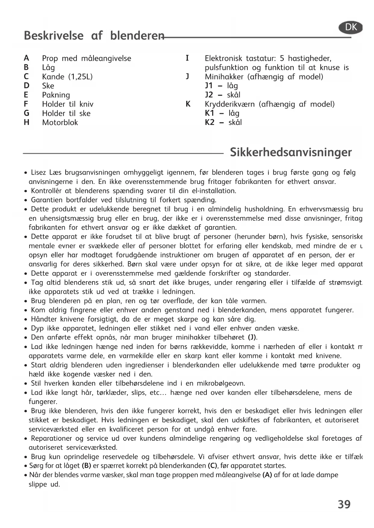 Elektronisk tastatur: 5 hastigheder, pulsfunktion og funktion til at knuse is Minihakker (afhængig af model) J1 – låg J2 – skål Krydderikværn (afhængig af model) K1 – låg K2 – skål DK40