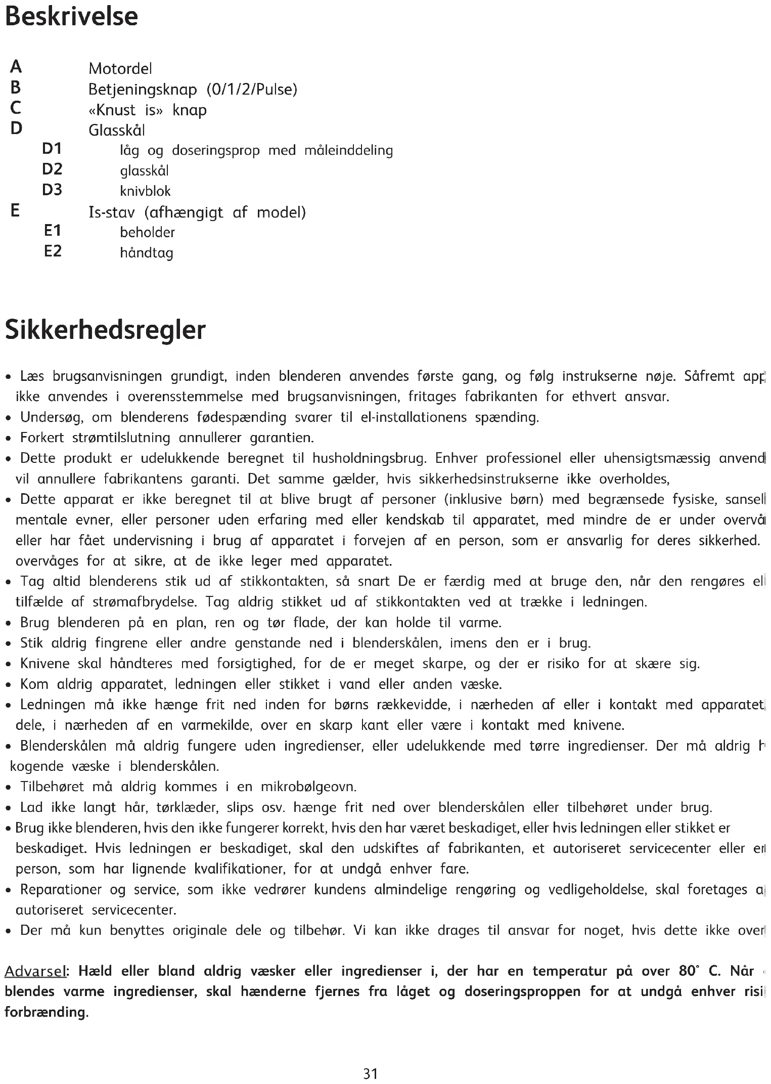 - Der må kun benyttes originale dele og tilbehør. Vi kan ikke drages til ansvar for noget, hvis dette ikke overholdes. Advarsel : Hæld eller bland aldrig væsker eller ingredienser i, der har en temperatur på over 80° C. Når der blendes varme ingredienser, skal hænderne fjernes fra låget og doseringsproppen for at undgå enhver risiko for forbrænding.32 Første anvendelse