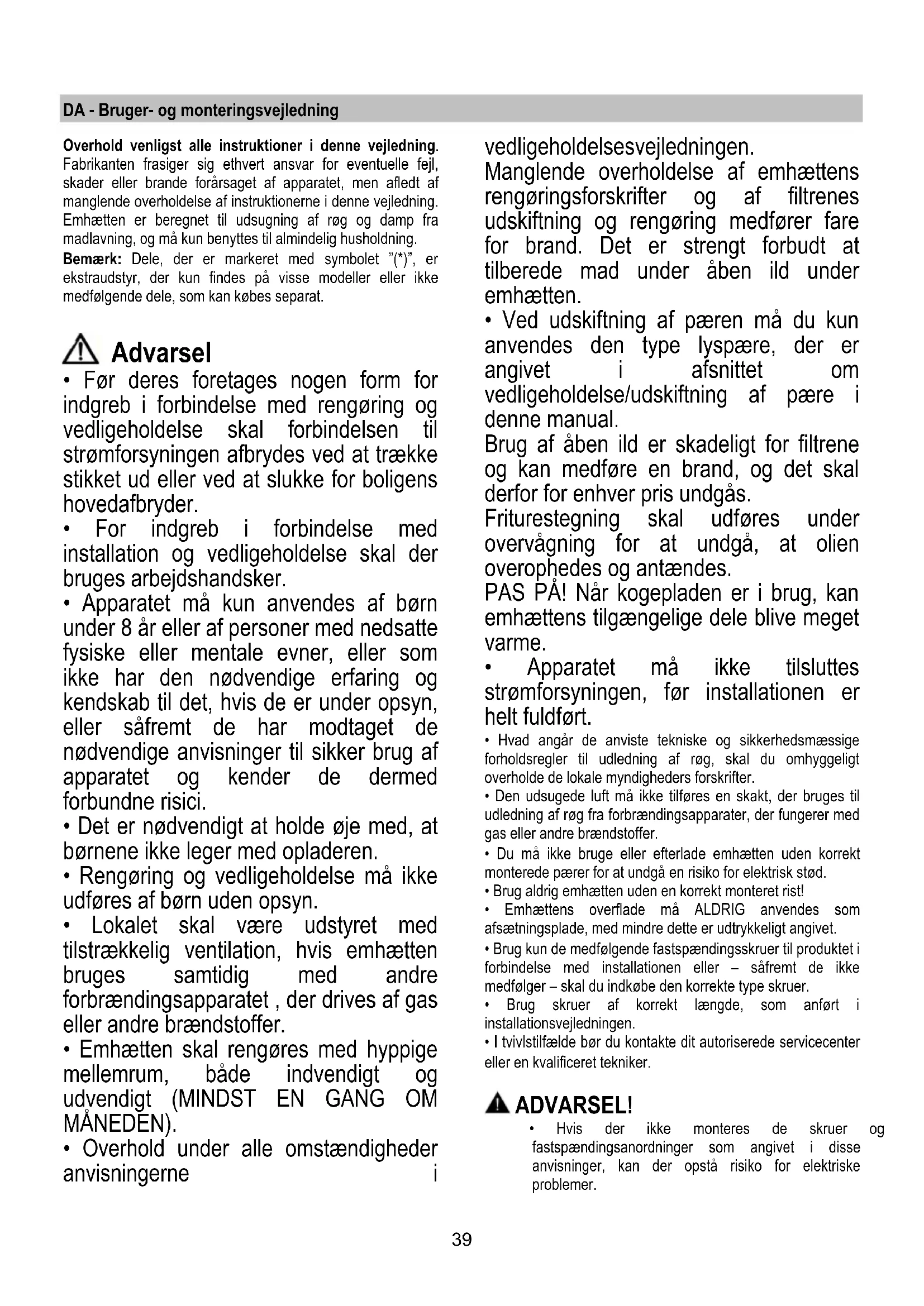 - Ved udskiftning af pæren må du kun anvendes den type lyspære, der er angivet i afsnittet om vedligeholdelse/udskiftning af pære i denne manual. Brug af åben ild er skadeligt for filtrene og kan medføre en brand, og det skal derfor for enhver pris undgås. Friturestegning skal udføres under overvågning for at undgå, at olien overophedes og antændes. PAS PÅ! Når kogepladen er i brug, kan emhættens tilgængelige dele blive meget varme.