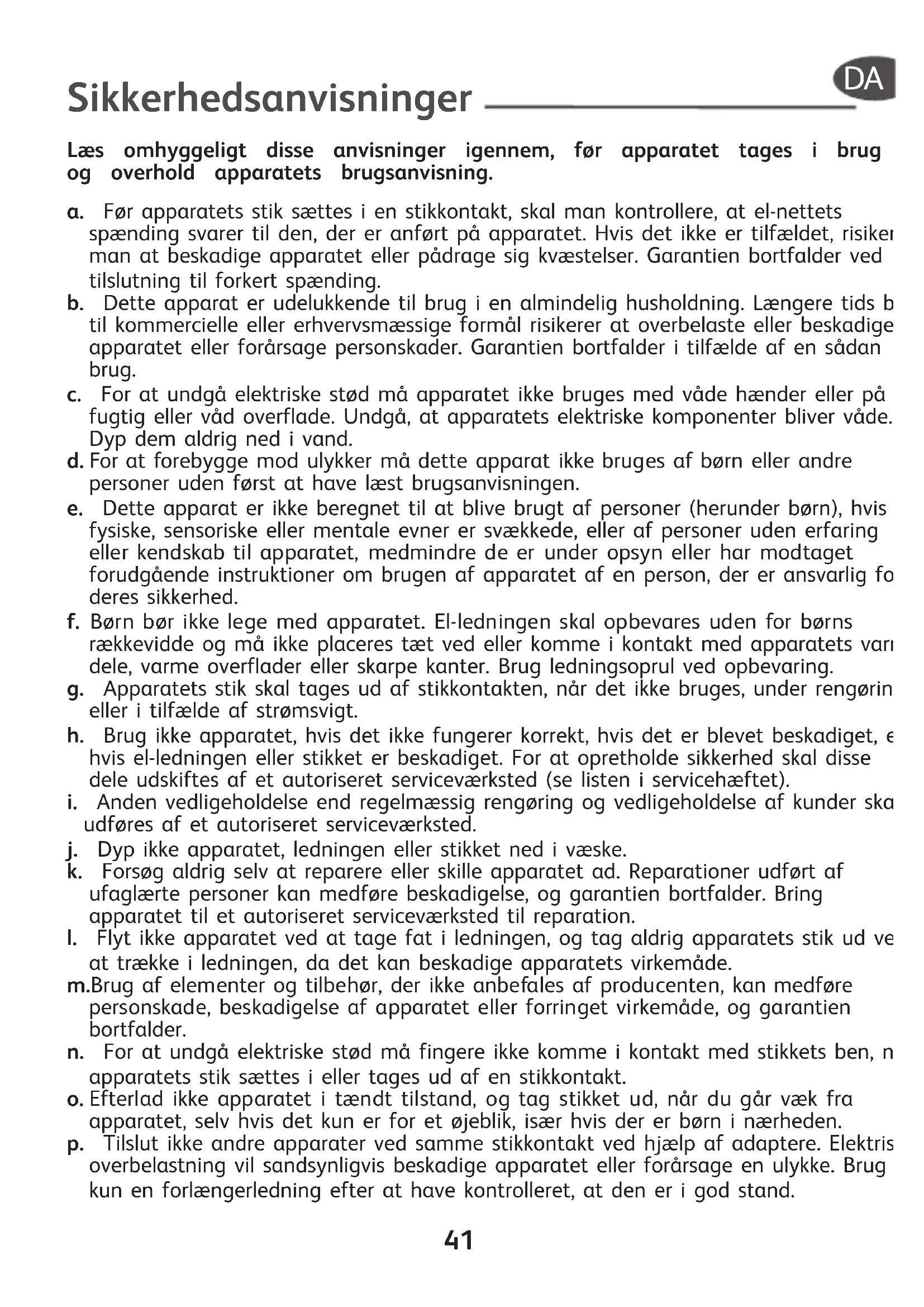 Käyttöikänsä loppuun tulleet sähköiset tai elektroniset tuotteet Ajattele ympäristöä! Laitteessa on lukuisia materiaaleja, jotka voidaan kerätä talteen tai kierrättää. Vie laite keräyspisteeseen tai valtuutettuun huoltokeskukseen.41 Sikkerhedsanvisninger Læs omhyggeligt disse anvisninger igennem, før apparatet tages i brug første gang, og overhold apparatets brugsanvisning. a. Før apparatets stik sættes i en stikkontakt, skal man kontrollere, at el-nettets spænding svarer til den, der er anført på apparatet. Hvis det ikke er tilfældet, risikerer man at beskadige apparatet eller pådrage sig kvæstelser. Garantien bortfalder ved tilslutning til forkert spænding. b. Dette apparat er udelukkende til brug i en almindelig husholdning. Længere tids brug til kommercielle eller erhvervsmæssige formål risikerer at overbelaste eller beskadige apparatet eller forårsage personskader. Garantien bortfalder i tilfælde af en sådan brug. c. For at undgå elektriske stød må apparatet ikke bruges med våde hænder eller på en fugtig eller våd overflade. Undgå, at apparatets elektriske komponenter bliver våde. Dyp dem aldrig ned i vand. d. For at forebygge mod ulykker må dette apparat ikke bruges af børn eller andre personer uden først at have læst brugsanvisningen. e. Dette apparat er ikke beregnet til at blive brugt af personer (herunder børn), hvis fysiske, sensoriske eller mentale evner er svækkede, eller af personer uden erfaring eller kendskab til apparatet, medmindre de er under opsyn eller har modtaget forudgående instruktioner om brugen af apparatet af en person, der er ansvarlig for deres sikkerhed. f. Børn bør ikke lege med apparatet. El-ledningen skal opbevares uden for børns rækkevidde og må ikke placeres tæt ved eller komme i kontakt med apparatets varme dele, varme overflader eller skarpe kanter. Brug ledningsoprul ved opbevaring. g. Apparatets stik skal tages ud af stikkontakten, når det ikke bruges, under rengøring eller i tilfælde af strømsvigt. h. Brug ikke apparatet, hvis det ikke fungerer korrekt, hvis det er blevet beskadiget, eller hvis el-ledningen eller stikket er beskadiget. For at opretholde sikkerhed skal disse dele udskiftes af et autoriseret serviceværksted (se listen i servicehæftet).