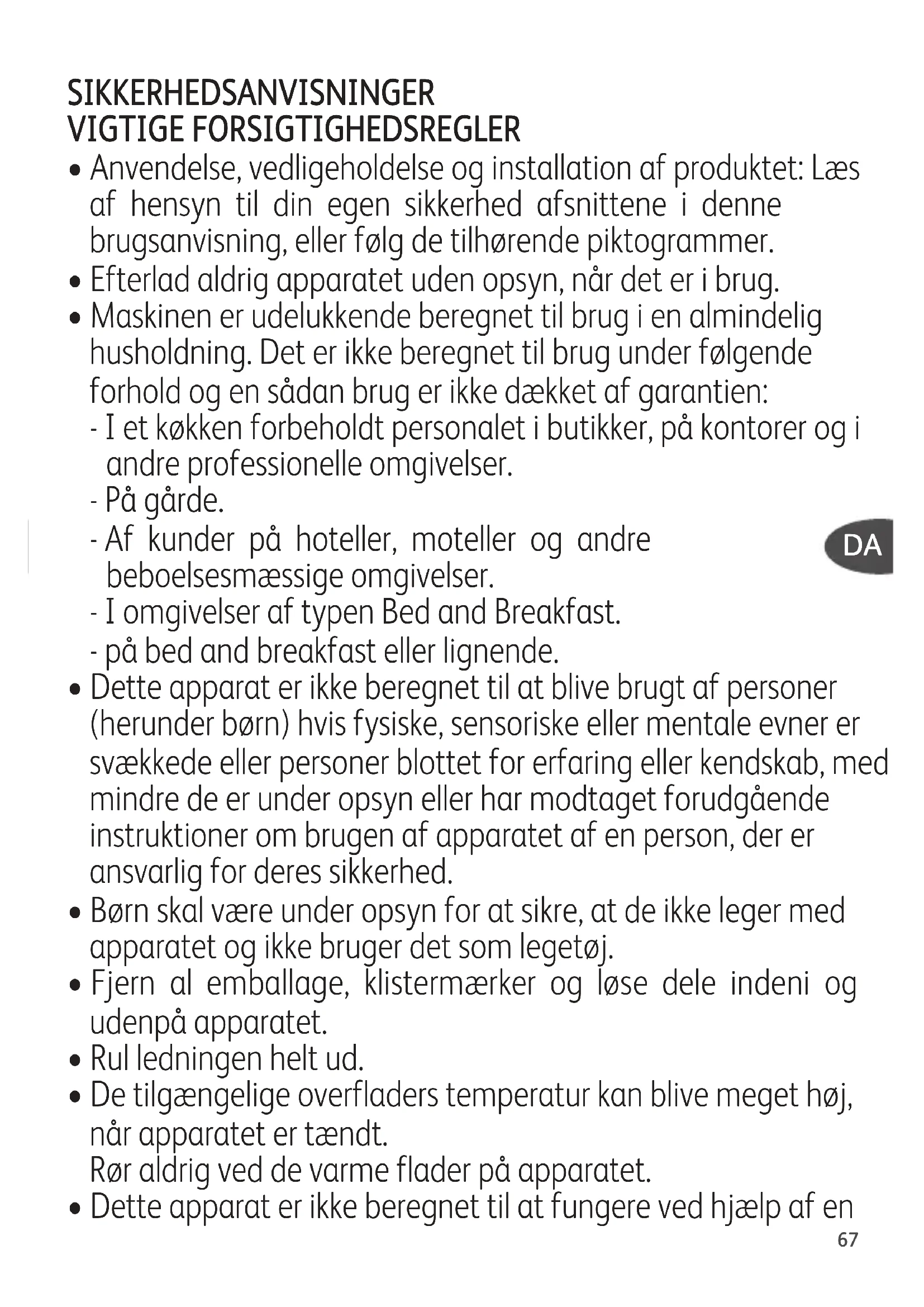 - Maskinen er udelukkende beregnet til brug i en almindelig husholdning. Det er ikke beregnet til brug under følgende forhold og en sådan brug er ikke dækket af garantien: - I et køkken forbeholdt personalet i butikker, på kontorer og i andre professionelle omgivelser. - På gårde. - Af kunder på hoteller, moteller og andre beboelsesmæssige omgivelser. - I omgivelser af typen Bed and Breakfast. - på bed and breakfast eller lignende.