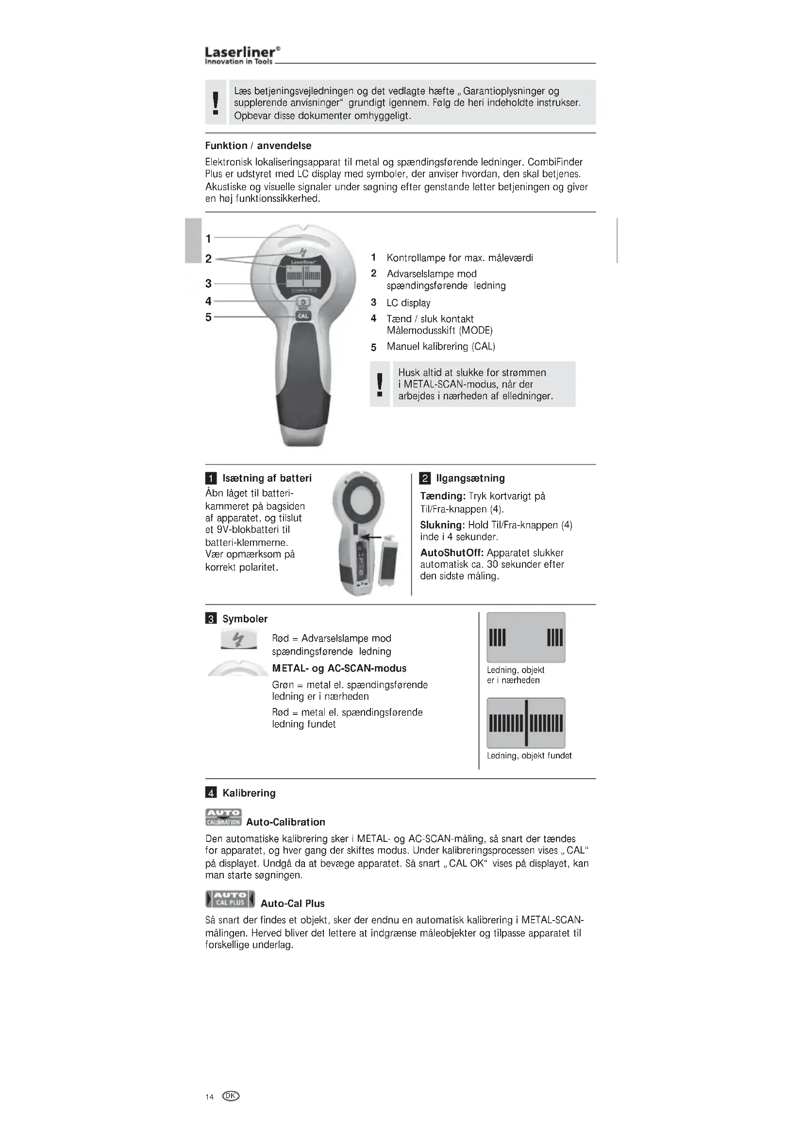 Elektronisk lokaliseringsapparat til metal og spændingsførende ledninger. CombiFinder Plus er udstyret med LC display med symboler, der anviser hvordan, den skal betjenes. Akustiske og visuelle signaler under søgning efter genstande letter betjeningen og giver en høj funktionssikkerhed. Kontrollampe for max. måleværdi Advarselslampe mod spændingsførende ledning LC display Tænd / sluk kontakt Målemodusskift (MODE) Manuel kalibrering (CAL) Åbn låget til batteri- kammeret på bagsiden af apparatet, og tilslut et 9V-blokbatteri til batteri-klemmerne. Vær opmærksom på korrekt polaritet. Isætning af batteri Tænding: Tryk kortvarigt på Til/Fra-knappen (4). Slukning: Hold Til/Fra-knappen (4) inde i 4 sekunder. AutoShutOff: Apparatet slukker automatisk ca. 30 sekunder efter den sidste måling. IIgangsætning Kalibrering Husk altid at slukke for strømmen i METAL-SCAN-modus, når der arbejdes i nærheden af elledninger.