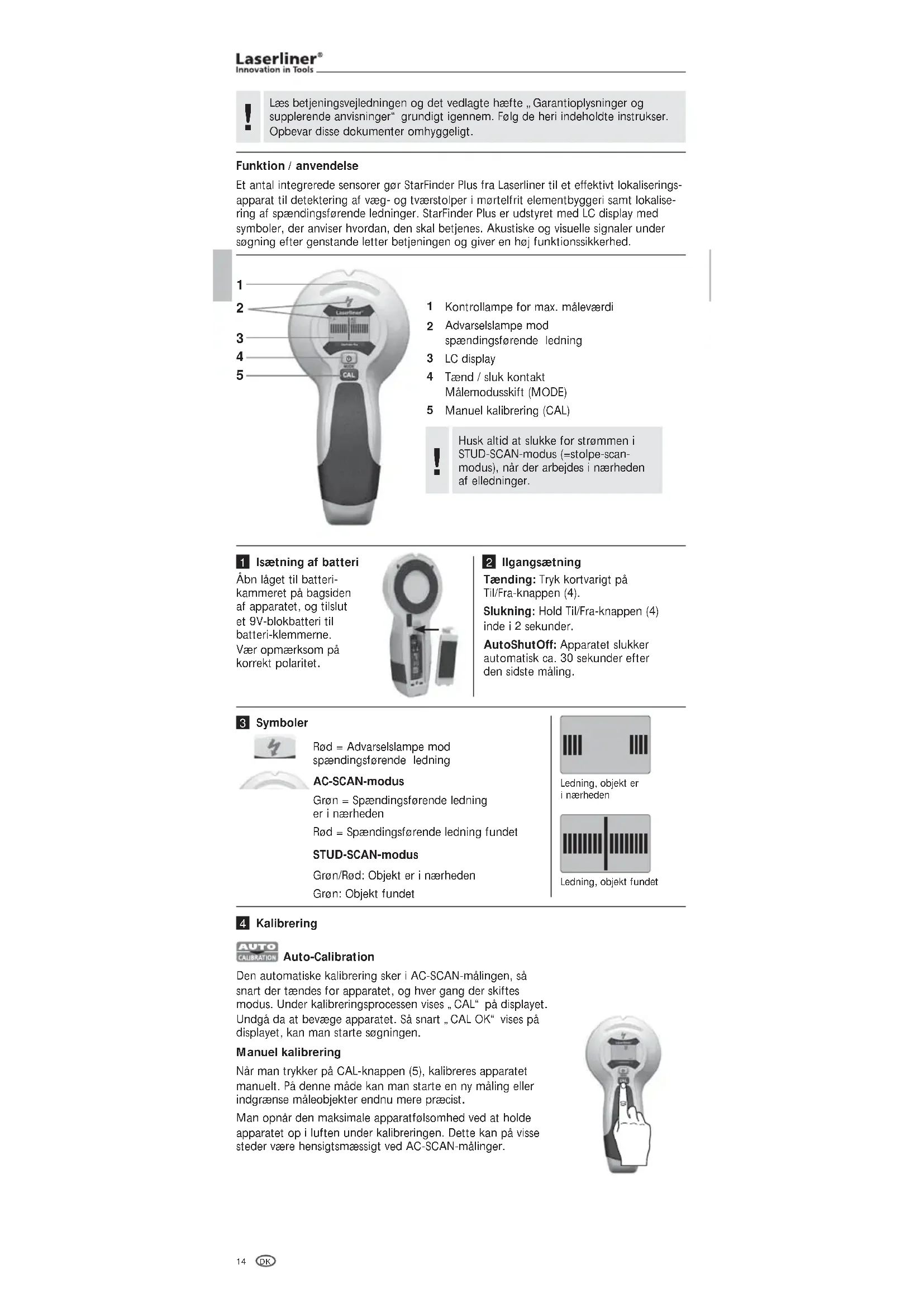 Funktion / anvendelse Et antal integrerede sensorer gør StarFinder Plus fra Laserliner til et effektivt lokaliserings- apparat til detektering af væg- og tværstolper i mørtelfrit elementbyggeri samt lokalise- ring af spændingsførende ledninger. StarFinder Plus er udstyret med LC display med symboler, der anviser hvordan, den skal betjenes. Akustiske og visuelle signaler under søgning efter genstande letter betjeningen og giver en høj funktionssikkerhed. Kontrollampe for max. måleværdi Advarselslampe mod spændingsførende ledning LC display Tænd / sluk kontakt Målemodusskift (MODE) Manuel kalibrering (CAL) Åbn låget til batteri- kammeret på bagsiden af apparatet, og tilslut et 9V-blokbatteri til batteri-klemmerne. Vær opmærksom på korrekt polaritet. Isætning af batteri Tænding: Tryk kortvarigt på Til/Fra-knappen (4). Slukning: Hold Til/Fra-knappen (4) inde i 2 sekunder. AutoShutOff: Apparatet slukker automatisk ca. 30 sekunder efter den sidste måling. IIgangsætning Auto-Calibration Den automatiske kalibrering sker i AC-SCAN-målingen, så snart der tændes for apparatet, og hver gang der skiftes modus. Under kalibreringsprocessen vises „CAL“ på displayet. Undgå da at bevæge apparatet. Så snart „CAL OK“ vises på displayet, kan man starte søgningen. Kalibrering Manuel kalibrering Når man trykker på CAL-knappen (5), kalibreres apparatet manuelt. På denne måde kan man starte en ny måling eller indgrænse måleobjekter endnu mere præcist. Man opnår den maksimale apparatfølsomhed ved at holde apparatet op i luften under kalibreringen. Dette kan på visse steder være hensigtsmæssigt ved AC-SCAN-målinger. Husk altid at slukke for strømmen i STUD-SCAN-modus (=stolpe-scan- modus), når der arbejdes i nærheden af elledninger.