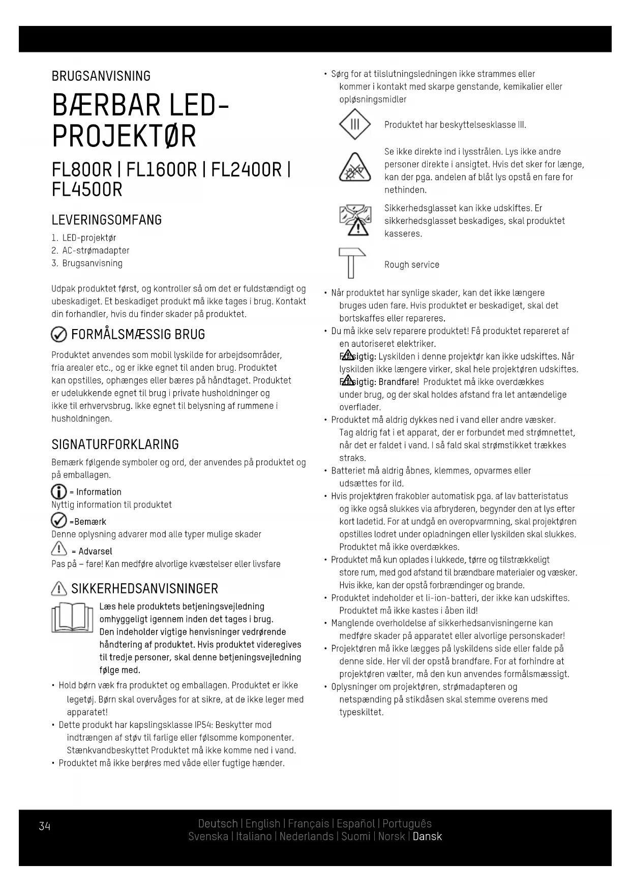 Produktet anvendes som mobil lyskilde for arbejdsområder, fria arealer etc., og er ikke egnet til anden brug. Produktet kan opstilles, ophænges eller bæres på håndtaget. Produktet er udelukkende egnet til brug i private husholdninger og ikke til erhvervsbrug. Ikke egnet til belysning af rummene i husholdningen. SIGNATURFORKLARING Bemærk følgende symboler og ord, der anvendes på produktet og på emballagen. = Information Nyttig information til produktet =Bemærk Denne oplysning advarer mod alle typer mulige skader = Advarsel Pas på – fare! Kan medføre alvorlige kvæstelser eller livsfare SIKKERHEDSANVISNINGER Læs hele produktets betjeningsvejledning omhyggeligt igennem inden det tages i brug. Den indeholder vigtige henvisninger vedrørende håndtering af produktet. Hvis produktet videregives til tredje personer, skal denne betjeningsvejledning følge med.