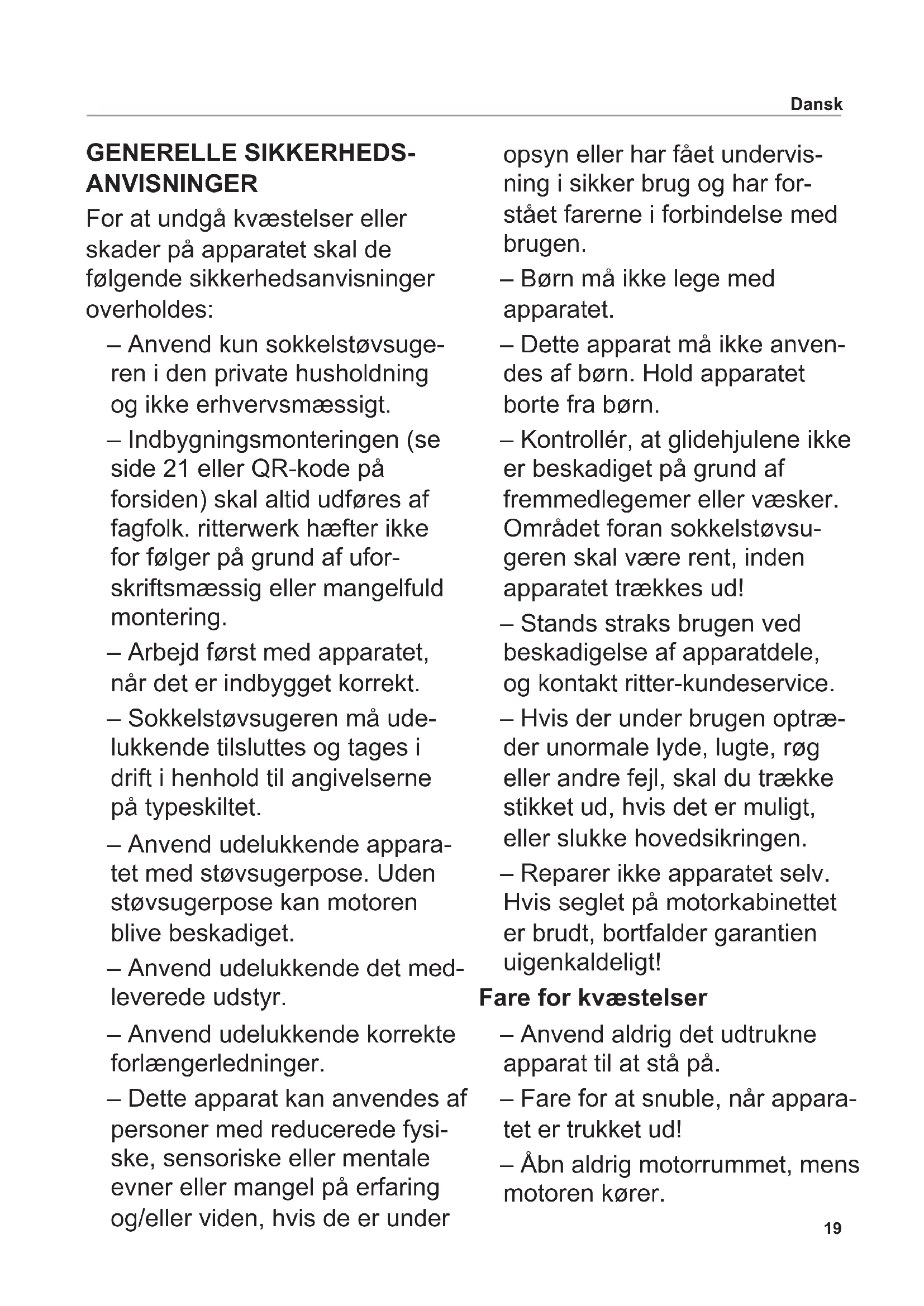 Postupujte v souladu s obrázky na přední a zadní obálce. Další informace k instalaci najdete na stránce www.ritterwerk.de/ installation-notes nebo přes kód QR na titulu. Bezpečnostní pokyny Abyste zabránili poranění osob nebo poškození přístroje, bez- podmínečně dodržujte následující bezpečnostní pokyny: – Přístroj musí instalovat pouze odborný pracovník. Společnost ritterwerk nenese zodpověd- nost za následky nepředpisové nebo chybné montáže. – Napájení musí být přivedeno tak, aby bylo možné pří- stroj zasunout bez skřípnutí napájení. Napájení musí být k systému volně přivedeno z elektrické zásuvky přímo do skříňky. – Před montáží vytáhněte síťo- vou vidlici ze zásuvky. Podmínky instalace Rozměry přístroje: – Šířka: Rámeček: 365 mm Přístroj: 342 mm – Výška přístroje: 103 mm Následující rozměry jsou minimální: – Světlá šířka: 365 mm – Světlá výška: 105 mm – Požadovaná hloubka: 460 mm Montáž zásuvky Upozornění: Ve výši vysavače do soklu musí být na zadní stěně nebo za ní k dispozici elektrická zásuvka (podle normy VDE/DIN 49440, ÖVE, SEV). Vysavač do soklu musí být možné při zapojené zástrčce zcela zasunout. Zástrčka musí být uživateli přístupná, aby mohl přístroj v případě potřeby (například při čištění) odpojit od napájení. Montáž vysavače do soklu Označte vybrání na soklové liště. Vyřežte vybrání. Vnitřní hrany otvoru natřete vodoodpudivou barvou. Zastrčte zástrčku do zásuvky a zasuňte vysavač do vybrání. Upozornění: Všechny údaje na výkresech jsou uvedeny v mm.19 Dansk GENERELLE SIKKERHEDS- ANVISNINGER For at undgå kvæstelser eller skader på apparatet skal de følgende sikkerhedsanvisninger overholdes: – Anvend kun sokkelstøvsuge- ren i den private husholdning og ikke erhvervsmæssigt. – Indbygningsmonteringen (se side 21 eller QR-kode på forsiden) skal altid udføres af fagfolk. ritterwerk hæfter ikke for følger på grund af ufor- skriftsmæssig eller mangelfuld montering. – Arbejd først med apparatet, når det er indbygget korrekt. – Sokkelstøvsugeren må ude- lukkende tilsluttes og tages i drift i henhold til angivelserne på typeskiltet. – Anvend udelukkende appara- tet med støvsugerpose. Uden støvsugerpose kan motoren blive beskadiget. – Anvend udelukkende det med- leverede udstyr. – Anvend udelukkende korrekte forlængerledninger. – Dette apparat kan anvendes af personer med reducerede fysi- ske, sensoriske eller mentale evner eller mangel på erfaring og/eller viden, hvis de er under opsyn eller har fået undervis- ning i sikker brug og har for- stået farerne i forbindelse med brugen. – Børn må ikke lege med apparatet. – Dette apparat må ikke anven- des af børn. Hold apparatet borte fra børn. – Kontrollér, at glidehjulene ikke er beskadiget på grund af fremmedlegemer eller væsker. Området foran sokkelstøvsu- geren skal være rent, inden apparatet trækkes ud! – Stands straks brugen ved beskadigelse af apparatdele, og kontakt ritter-kundeservice. – Hvis der under brugen optræ- der unormale lyde, lugte, røg eller andre fejl, skal du trække stikket ud, hvis det er muligt, eller slukke hovedsikringen. – Reparer ikke apparatet selv. Hvis seglet på motorkabinettet er brudt, bortfalder garantien uigenkaldeligt! Fare for kvæstelser – Anvend aldrig det udtrukne apparat til at stå på. – Fare for at snuble, når appara- tet er trukket ud! – Åbn aldrig motorrummet, mens motoren kører.20 Dansk Læs anvisningen omhyggeligt, inden apparatet tages i brug. Opbevar brugsanvisningen, og udlever den, hvis apparatet vide- regives til en anden. Alternativt er den aktuelle brugsanvisning til rådighed på www.ritterwerk.de. FORMÅL Sokkelstøvsugeren anvendes til hurtig fjernelse af krummer og støv i køkkenet. Ikke korrekt brug eller forkert betjening kan medføre alvorlige kvæstelser eller beskadigelse af apparatet. I det tilfælde bortfalder samtlige garanti- og ansvarskrav. SUGNING