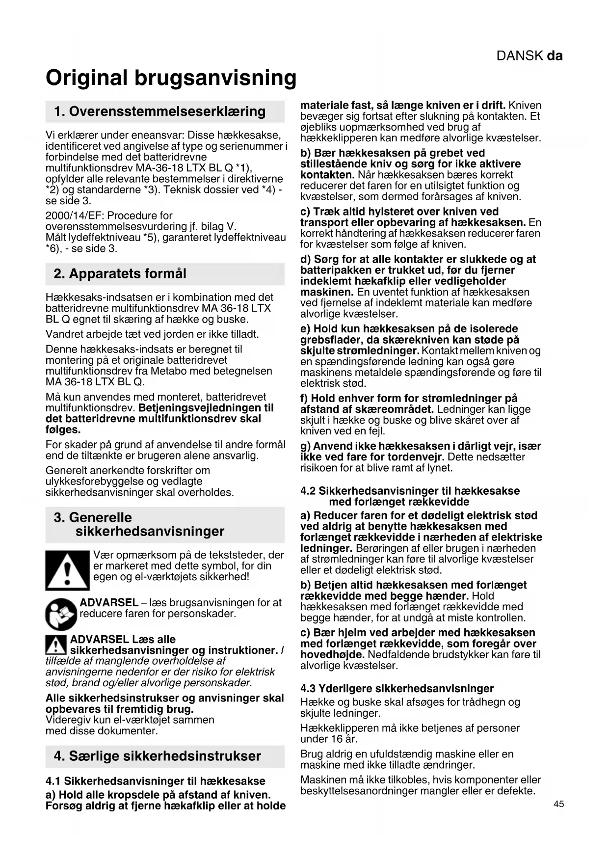 Original brugsanvisning Vi erklærer under eneansvar: Disse hækkesakse, identificeret ved angivelse af type og serienummer i forbindelse med det batteridrevne multifunktionsdrev MA-36-18 LTX BL Q *1), opfylder alle relevante bestemmelser i direktiverne *2) og standarderne *3). Teknisk dossier ved *4) - se side 3. 2000/14/EF: Procedure for overensstemmelsesvurdering jf. bilag V. Målt lydeffektniveau *5), garanteret lydeffektniveau *6), - se side 3. Hækkesaks-indsatsen er i kombination med det batteridrevne multifunktionsdrev MA 36-18 LTX BL Q egnet til skæring af hække og buske. Vandret arbejde tæt ved jorden er ikke tilladt. Denne hækkesaks-indsats er beregnet til montering på et originale batteridrevet multifunktionsdrev fra Metabo med betegnelsen MA 36-18 LTX BL Q. Må kun anvendes med monteret, batteridrevet multifunktionsdrev. Betjeningsvejledningen til det batteridrevne multifunktionsdrev skal følges. For skader på grund af anvendelse til andre formål end de tiltænkte er brugeren alene ansvarlig. Generelt anerkendte forskrifter om ulykkesforebyggelse og vedlagte sikkerhedsanvisninger skal overholdes. Vær opmærksom på de tekststeder, der er markeret med dette symbol, for din egen og el-værktøjets sikkerhed! ADVARSEL – læs brugsanvisningen for at reducere faren for personskader. ADVARSEL Læs alle sikkerhedsanvisninger og instruktioner. I tilfælde af manglende overholdelse af anvisningerne nedenfor er der risiko for elektrisk stød, brand og/eller alvorlige personskader. Alle sikkerhedsinstrukser og anvisninger skal opbevares til fremtidig brug. Videregiv kun el-værktøjet sammen med disse dokumenter.