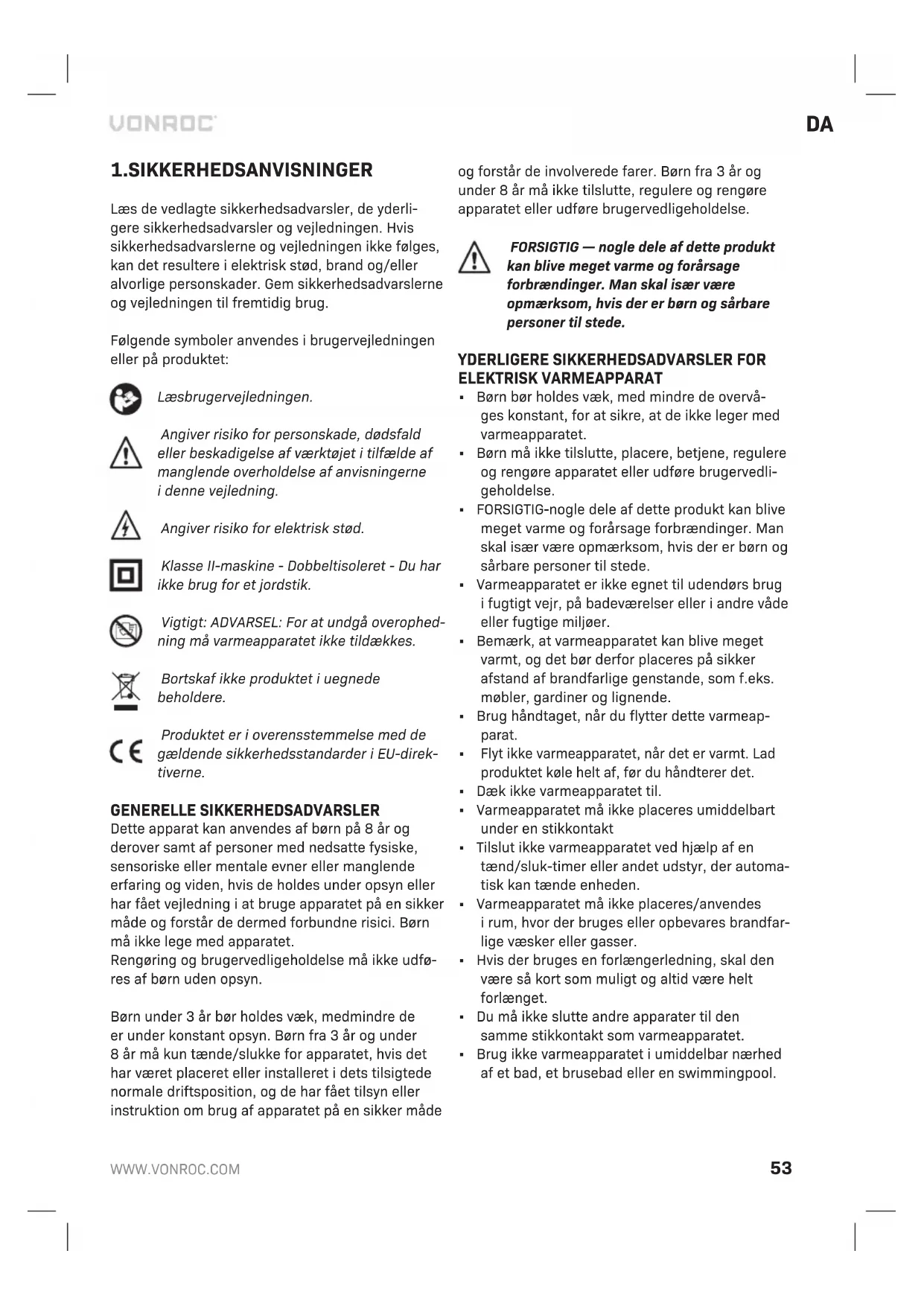 Læs de vedlagte sikkerhedsadvarsler, de yderli- gere sikkerhedsadvarsler og vejledningen. Hvis sikkerhedsadvarslerne og vejledningen ikke følges, kan det resultere ielektrisk stød, brand og/eller alvorlige personskader. Gem sikkerhedsadvarslerne og vejledningen til fremtidig brug. Følgende symboler anvendes ibrugervejledningen eller på produktet: Læs brugervejledningen. Angiver risiko for personskade, dødsfald eller beskadigelse af værktøjet itilfælde af manglende overholdelse af anvisningerne idenne vejledning. Angiver risiko for elektrisk stød. Klasse II-maskine - Dobbeltisoleret - Du har ikke brug for et jordstik. Vigtigt: ADVARSEL: For at undgå overophed- ning må varmeapparatet ikke tildækkes. Bortskaf ikke produktet iuegnede beholdere. Produktet er ioverensstemmelse med de gældende sikkerhedsstandarder iEU-direk- tiverne. GENERELLE SIKKERHEDSADVARSLER Dette apparat kan anvendes af børn på 8 år og derover samt af personer med nedsatte fysiske, sensoriske eller mentale evner eller manglende erfaring og viden, hvis de holdes under opsyn eller har fået vejledning iat bruge apparatet på en sikker måde og forstår de dermed forbundne risici. Børn må ikke lege med apparatet. Rengøring og brugervedligeholdelse må ikke udfø- res af børn uden opsyn. Børn under 3 år bør holdes væk, medmindre de er under konstant opsyn. Børn fra 3 år og under 8 år må kun tænde/slukke for apparatet, hvis det har været placeret eller installeret idets tilsigtede normale driftsposition, og de har fået tilsyn eller instruktion om brug af apparatet på en sikker måde og forstår de involverede farer. Børn fra 3 år og under 8 år må ikke tilslutte, regulere og rengøre apparatet eller udføre brugervedligeholdelse. FORSIGTIG — nogle dele af dette produkt kan blive meget varme og forårsage forbrændinger. Man skal især være opmærksom, hvis der er børn og sårbare personer til stede.