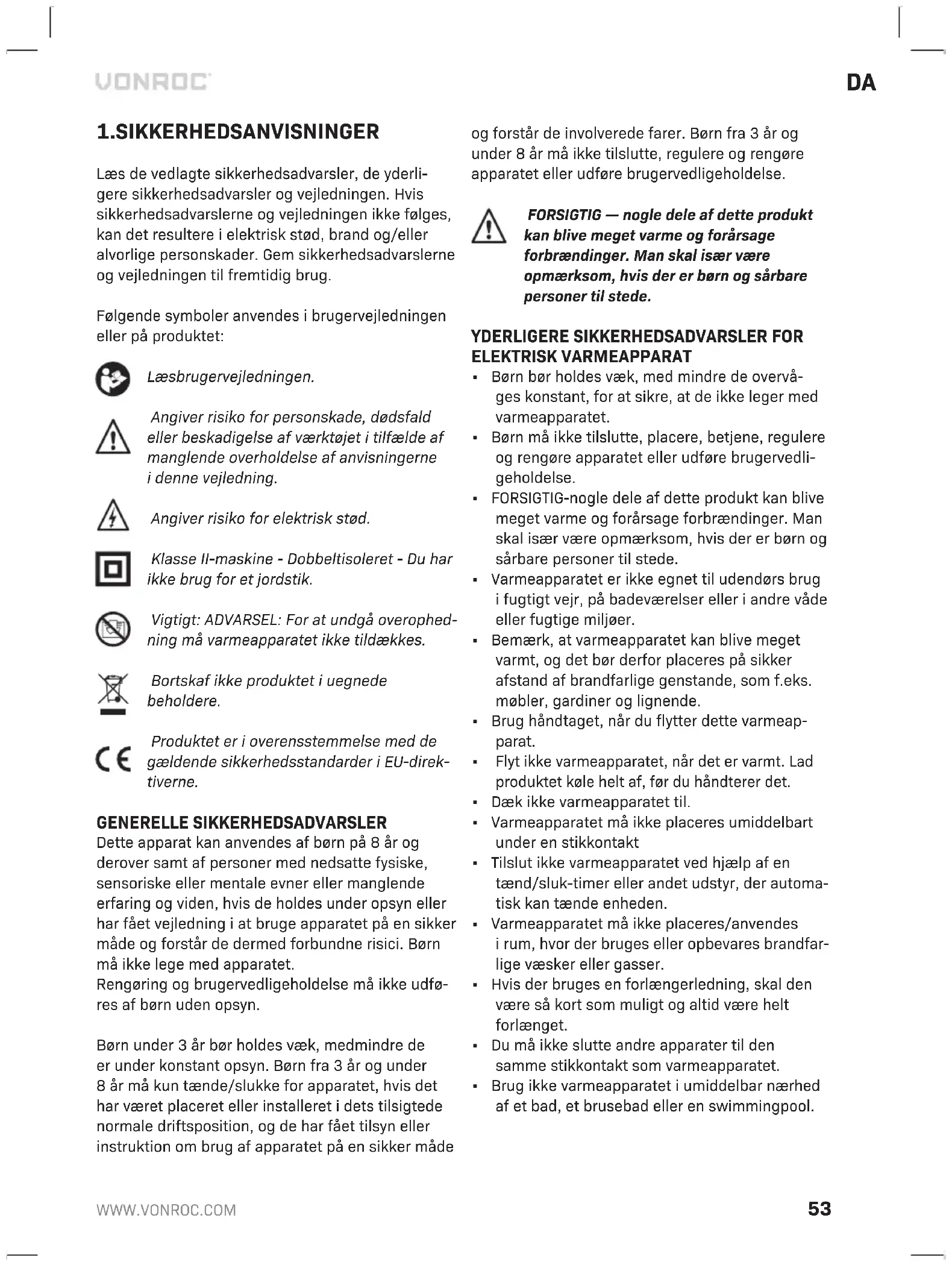 Læs de vedlagte sikkerhedsadvarsler, de yderli- gere sikkerhedsadvarsler og vejledningen. Hvis sikkerhedsadvarslerne og vejledningen ikke følges, kan det resultere ielektrisk stød, brand og/eller alvorlige personskader. Gem sikkerhedsadvarslerne og vejledningen til fremtidig brug. Følgende symboler anvendes ibrugervejledningen eller på produktet: Læs brugervejledningen. Angiver risiko for personskade, dødsfald eller beskadigelse af værktøjet itilfælde af manglende overholdelse af anvisningerne idenne vejledning. Angiver risiko for elektrisk stød. Klasse II-maskine - Dobbeltisoleret - Du har ikke brug for et jordstik. Vigtigt: ADVARSEL: For at undgå overophed- ning må varmeapparatet ikke tildækkes. Bortskaf ikke produktet iuegnede beholdere. Produktet er ioverensstemmelse med de gældende sikkerhedsstandarder iEU-direk- tiverne. GENERELLE SIKKERHEDSADVARSLER Dette apparat kan anvendes af børn på 8 år og derover samt af personer med nedsatte fysiske, sensoriske eller mentale evner eller manglende erfaring og viden, hvis de holdes under opsyn eller har fået vejledning iat bruge apparatet på en sikker måde og forstår de dermed forbundne risici. Børn må ikke lege med apparatet. Rengøring og brugervedligeholdelse må ikke udfø- res af børn uden opsyn. Børn under 3 år bør holdes væk, medmindre de er under konstant opsyn. Børn fra 3 år og under 8 år må kun tænde/slukke for apparatet, hvis det har været placeret eller installeret idets tilsigtede normale driftsposition, og de har fået tilsyn eller instruktion om brug af apparatet på en sikker måde og forstår de involverede farer. Børn fra 3 år og under 8 år må ikke tilslutte, regulere og rengøre apparatet eller udføre brugervedligeholdelse. FORSIGTIG — nogle dele af dette produkt kan blive meget varme og forårsage forbrændinger. Man skal især være opmærksom, hvis der er børn og sårbare personer til stede.