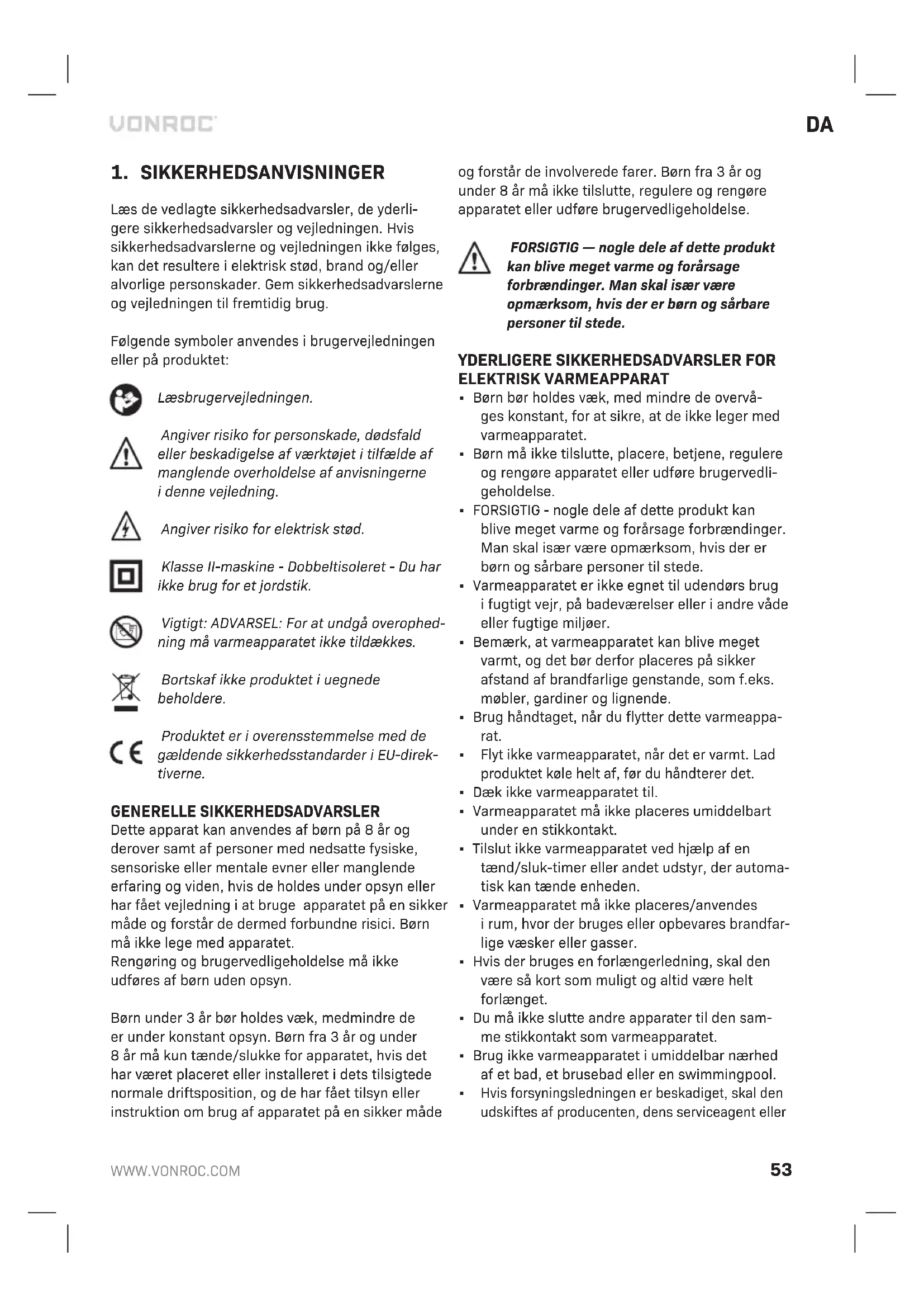 Læs de vedlagte sikkerhedsadvarsler, de yderli- gere sikkerhedsadvarsler og vejledningen. Hvis sikkerhedsadvarslerne og vejledningen ikke følges, kan det resultere ielektrisk stød, brand og/eller alvorlige personskader. Gem sikkerhedsadvarslerne og vejledningen til fremtidig brug. Følgende symboler anvendes ibrugervejledningen eller på produktet: Læs brugervejledningen. Angiver risiko for personskade, dødsfald eller beskadigelse af værktøjet itilfælde af manglende overholdelse af anvisningerne idenne vejledning. Angiver risiko for elektrisk stød. Klasse II-maskine - Dobbeltisoleret - Du har ikke brug for et jordstik. Vigtigt: ADVARSEL: For at undgå overophed- ning må varmeapparatet ikke tildækkes. Bortskaf ikke produktet iuegnede beholdere. Produktet er ioverensstemmelse med de gældende sikkerhedsstandarder iEU-direk- tiverne. GENERELLE SIKKERHEDSADVARSLER Dette apparat kan anvendes af børn på 8 år og derover samt af personer med nedsatte fysiske, sensoriske eller mentale evner eller manglende erfaring og viden, hvis de holdes under opsyn eller har fået vejledning iat bruge apparatet på en sikker måde og forstår de dermed forbundne risici. Børn må ikke lege med apparatet. Rengøring og brugervedligeholdelse må ikke udføres af børn uden opsyn. Børn under 3 år bør holdes væk, medmindre de er under konstant opsyn. Børn fra 3 år og under 8 år må kun tænde/slukke for apparatet, hvis det har været placeret eller installeret idets tilsigtede normale driftsposition, og de har fået tilsyn eller instruktion om brug af apparatet på en sikker måde og forstår de involverede farer. Børn fra 3 år og under 8 år må ikke tilslutte, regulere og rengøre apparatet eller udføre brugervedligeholdelse. FORSIGTIG — nogle dele af dette produkt kan blive meget varme og forårsage forbrændinger. Man skal især være opmærksom, hvis der er børn og sårbare personer til stede.