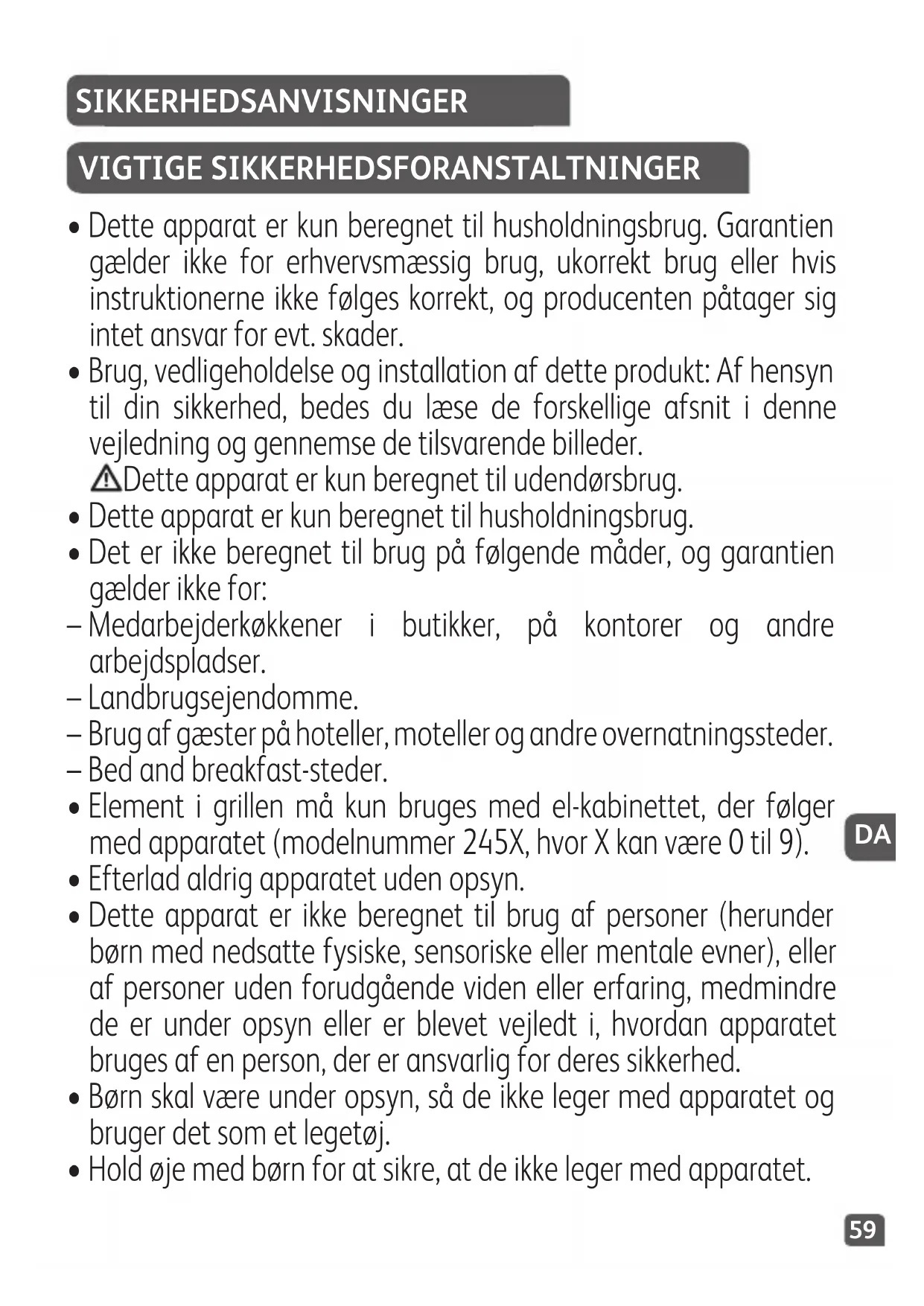 - Element i grillen må kun bruges med el-kabinettet, der følger med apparatet (modelnummer 245X, hvor X kan være 0 til 9).