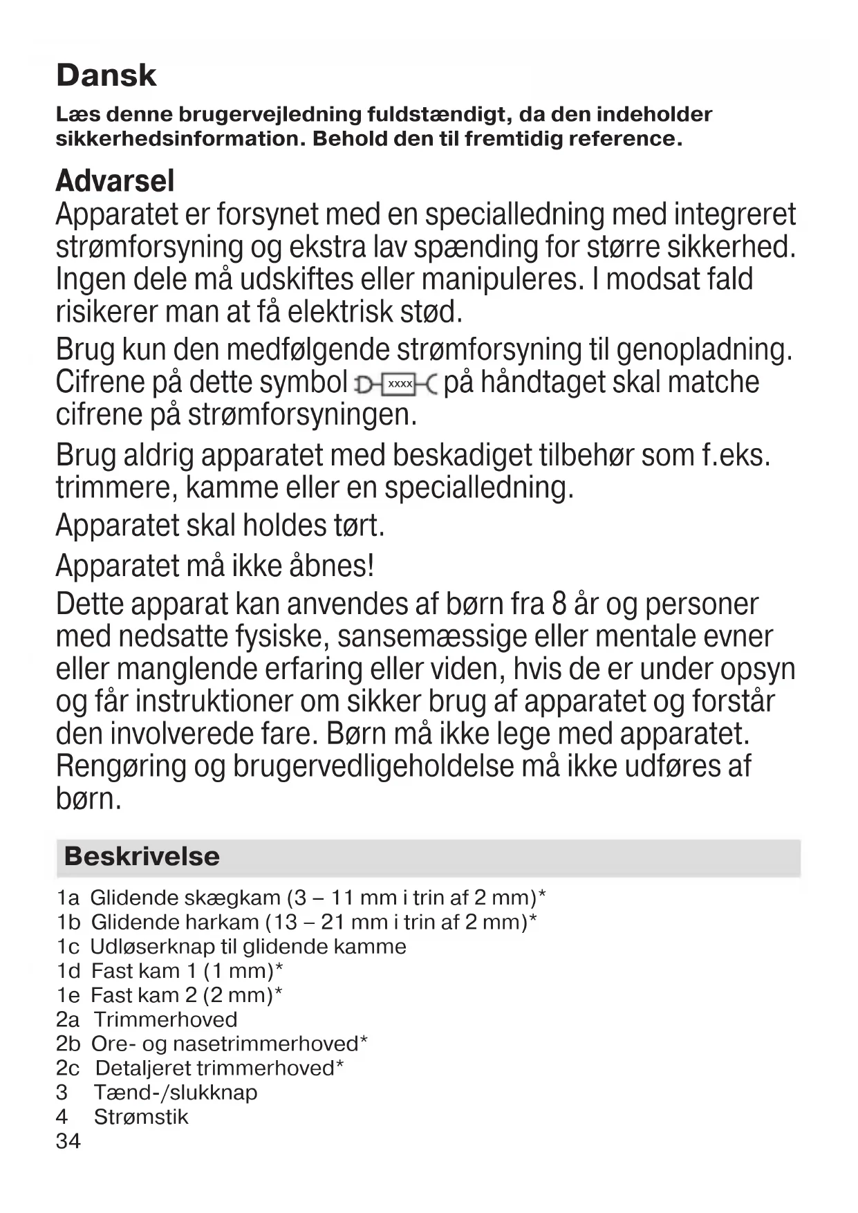 - Når apparatet er fuldt opladet, aflades det (til det er tomt) ved normal brug. Derefter genoplades apparatet til fuld kapacitet. Anvendelse Delene må kun udskiftes, når apparatet er slukket. Skub start/stop-knappen (3) op for at tænde for apparatet. Skægtrimning / hårklipning Glidende kamme (1a, 1b): Placer en af kammene over trimmerhovedet (2a). Tryk på udløserknappen (1c), og skub kammen ud til den ønskede hårlængde. Faste kamme (1d, 1e): Klik en af kammene fast på trimmerhovedet (2a).