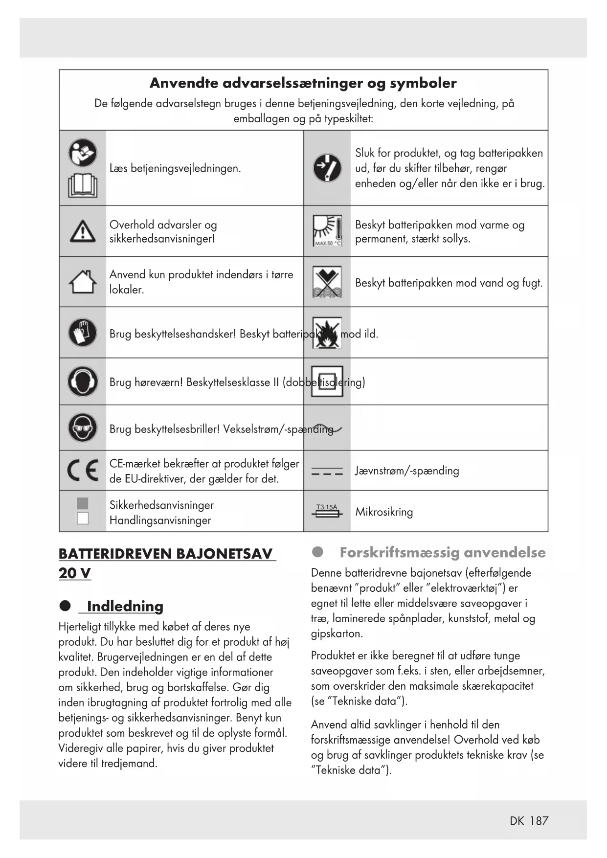 Anvendte advarselssætninger og symboler De følgende advarselstegn bruges i denne betjeningsvejledning, den korte vejledning, på emballagen og på typeskiltet: Læs betjeningsvejledningen. Sluk for produktet, og tag batteripakken ud, før du skifter tilbehør, rengør enheden og/eller når den ikke er i brug. Overhold advarsler og sikkerhedsanvisninger! Beskyt batteripakken mod varme og permanent, stærkt sollys. Anvend kun produktet indendørs i tørre lokaler. Beskyt batteripakken mod vand og fugt. Brug beskyttelseshandsker! Beskyt batteripakken mod ild. Brug høreværn! BeskyttelsesklasseII (dobbeltisolering) Brug beskyttelsesbriller! Vekselstrøm/-spænding CE-mærket bekræfter at produktet følger de EU-direktiver, der gælder for det. Jævnstrøm/-spænding Sikkerhedsanvisninger Handlingsanvisninger T3.15A Mikrosikring BATTERIDREVEN BAJONETSAV 20 V Indledning Hjerteligt tillykke med købet af deres nye produkt. Du har besluttet dig for et produkt af høj kvalitet. Brugervejledningen er en del af dette produkt. Den indeholder vigtige informationer om sikkerhed, brug og bortskaffelse. Gør dig inden ibrugtagning af produktet fortrolig med alle betjenings- og sikkerhedsanvisninger. Benyt kun produktet som beskrevet og til de oplyste formål. Videregiv alle papirer, hvis du giver produktet videre til tredjemand. Forskriftsmæssig anvendelse Denne batteridrevne bajonetsav (efterfølgende benævnt ”produkt” eller ”elektroværktøj”) er egnet til lette eller middelsvære saveopgaver i træ, laminerede spånplader, kunststof, metal og gipskarton. Produktet er ikke beregnet til at udføre tunge saveopgaver som f.eks. i sten, eller arbejdsemner, som overskrider den maksimale skærekapacitet (se ”Tekniske data”). Anvend altid savklinger i henhold til den forskriftsmæssige anvendelse! Overhold ved køb og brug af savklinger produktets tekniske krav (se ”Tekniske data”).188