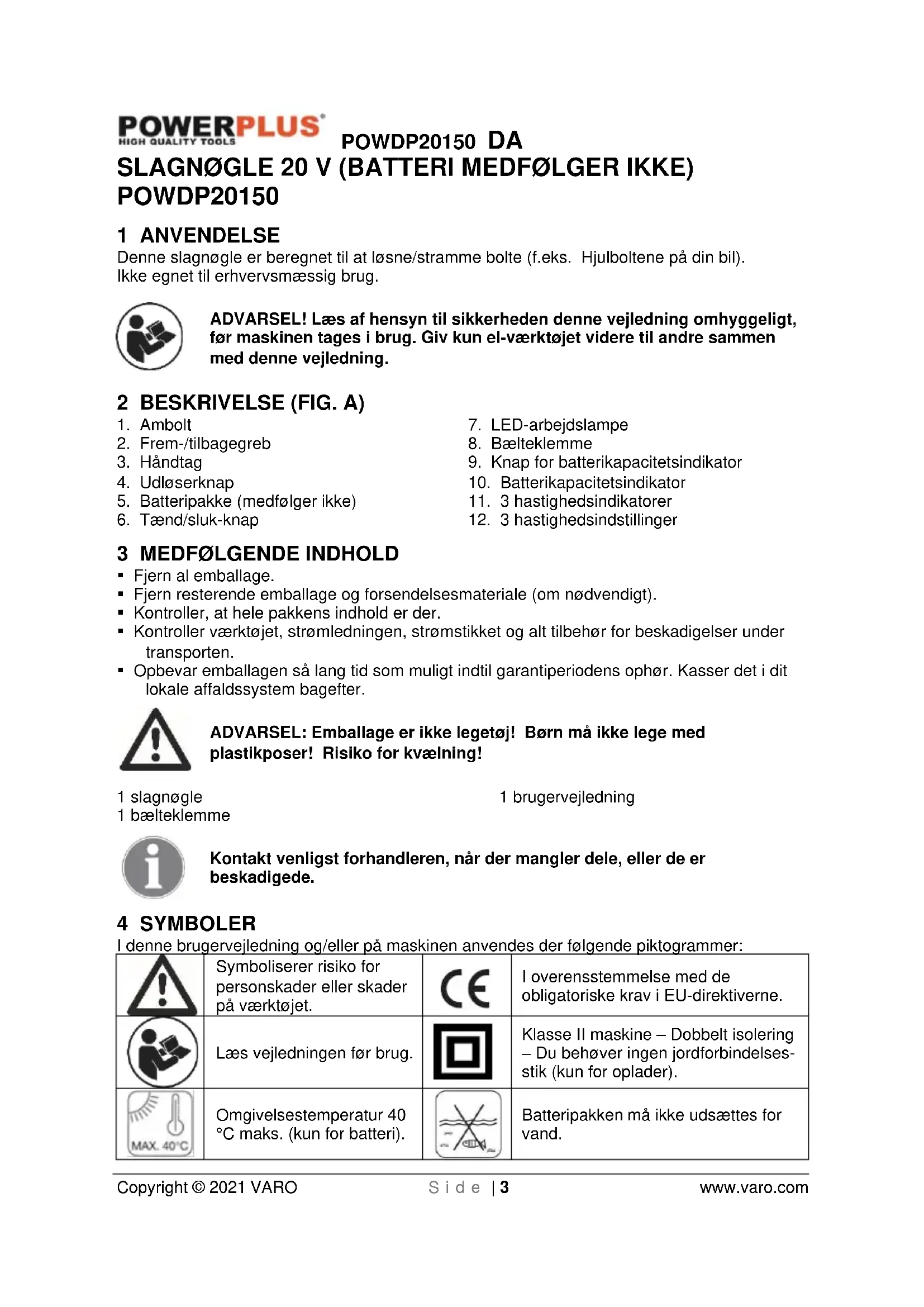 Copyright © 2021 VARO S i d e | 3 www.varo.com SLAGNØGLE 20 V (BATTERI MEDFØLGER IKKE) POWDP20150 1 ANVENDELSE Denne slagnøgle er beregnet til at løsne/stramme bolte (f.eks. Hjulboltene på din bil). Ikke egnet til erhvervsmæssig brug. ADVARSEL! Læs af hensyn til sikkerheden denne vejledning omhyggeligt, før maskinen tages i brug. Giv kun el-værktøjet videre til andre sammen med denne vejledning. 2 BESKRIVELSE (FIG. A)