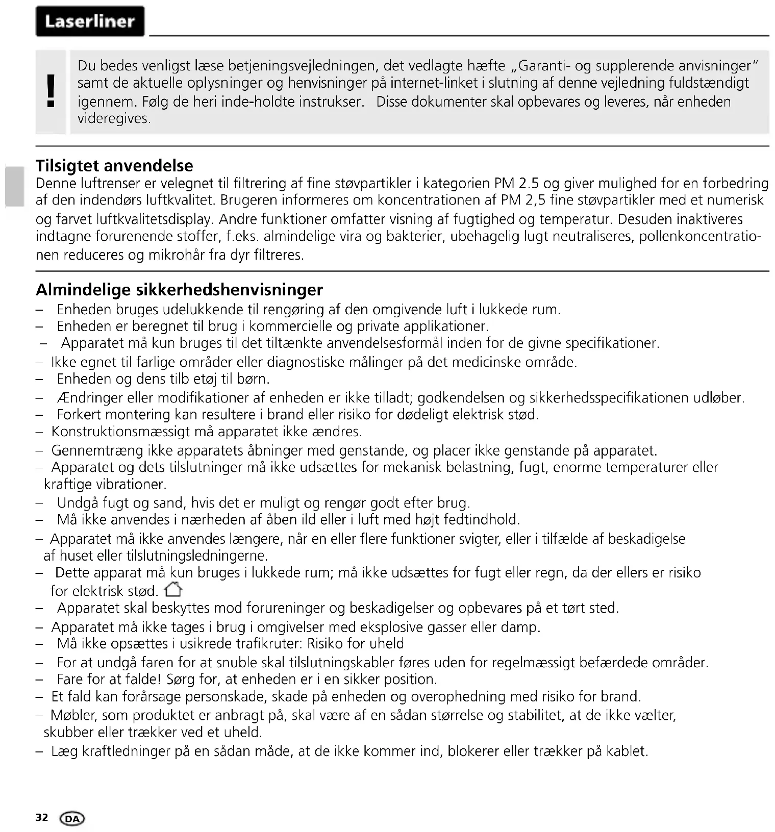 25μg/m³ Omgevingstemperatuur Meetbereik Nauwkeurigheid Resolutie 0…50°C ±0.5 °C 1°C Luchtvochtigheid Meetbereik (relatief) Nauwkeurigheid (absoluut) Resolutie 20…95%rH ±3%rH 5%rH Sensortype Fijn stof, Temperatuur, Luchtvochtigheid Stroomverzorging Netspanning 230V / 50 Hz Werkomstandigheden 0°C … 60°C, luchtvochtigheidmax.75%rH,niet-condenserend Opslagvoorwaarden -10°C … 60°C, luchtvochtigheidmax.85%rH,niet-condenserend Kabellengte 1,5 m 1,5 m Afmetingen (B x H x D) 410 x 630 x 210 mm Gewicht 7000 g NL32 Tilsigtet anvendelse DenneluftrenserervelegnettilltreringafnestøvpartiklerikategorienPM2.5oggivermulighedforenforbedring afdenindendørsluftkvalitet.BrugereninformeresomkoncentrationenafPM2,5nestøvpartiklermedetnumerisk og farvet luftkvalitetsdisplay. Andre funktioner omfatter visning af fugtighed og temperatur. Desuden inaktiveres indtagne forurenende stoffer, f.eks. almindelige vira og bakterier, ubehagelig lugt neutraliseres, pollenkoncentratio- nenreduceresogmikrohårfradyrltreres. Almindelige sikkerhedshenvisninger – Enhedenbrugesudelukkendetilrengøringafdenomgivendeluftilukkederum. – Enhedenerberegnettilbrugikommercielleogprivateapplikationer. – Apparatetmåkunbrugestildettiltænkteanvendelsesformålindenfordegivnespecikationer. – Ikke egnet til farlige områder eller diagnostiske målinger på det medicinske område. – Enhedenogdenstilbetøjtilbørn. – Ændringerellermodikationerafenhedenerikketilladt;godkendelsenogsikkerhedsspecikationenudløber. – Forkertmonteringkanresultereibrandellerrisikofordødeligtelektriskstød. – Konstruktionsmæssigt må apparatet ikke ændres. – Gennemtræng ikke apparatets åbninger med genstande, og placer ikke genstande på apparatet. – Apparatet og dets tilslutninger må ikke udsættes for mekanisk belastning, fugt, enorme temperaturer eller kraftige vibrationer. – Undgåfugtogsand,hvisdetermuligtogrengørgodtefterbrug. – Måikkeanvendesinærhedenafåbenildelleriluftmedhøjtfedtindhold. – Apparatetmåikkeanvendeslængere,nårenellererefunktionersvigter,elleritilfældeafbeskadigelse af huset eller tilslutningsledningerne. – Dette apparat må kun bruges i lukkede rum; må ikke udsættes for fugt eller regn, da der ellers er risiko forelektriskstød. – Apparatetskalbeskyttesmodforureningerogbeskadigelserogopbevarespåettørtsted. – Apparatet må ikke tages i brug i omgivelser med eksplosive gasser eller damp. – Måikkeopsættesiusikredetrakruter:Risikoforuheld – Foratundgåfarenforatsnubleskaltilslutningskablerføresudenforregelmæssigtbefærdedeområder. – Fareforatfalde!Sørgfor,atenhedeneriensikkerposition. – Et fald kan forårsage personskade, skade på enheden og overophedning med risiko for brand. – Møbler,somprodukteteranbragtpå,skalværeafensådanstørrelseogstabilitet,atdeikkevælter, skubber eller trækker ved et uheld. – Læg kraftledninger på en sådan måde, at de ikke kommer ind, blokerer eller trækker på kablet. Du bedes venligst læse betjeningsvejledningen, det vedlagte hæfte „Garanti- og supplerende anvisninger“ samt de aktuelle oplysninger og henvisninger på internet-linket i slutning af denne vejledning fuldstændigt igennem.Følgdeheriinde-holdteinstrukser. Disse dokumenter skal opbevares og leveres, når enheden videregives.