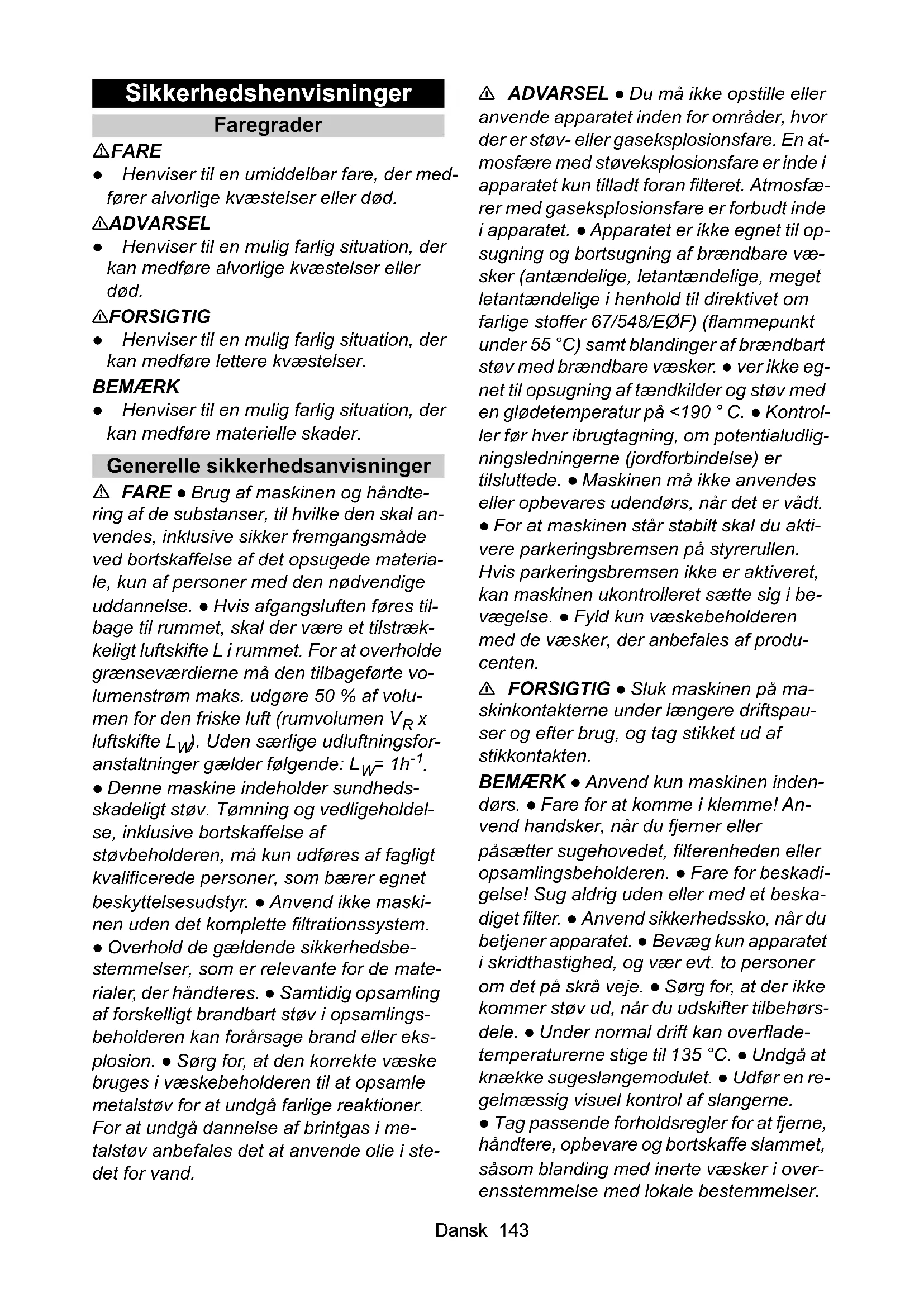 • EU-overensstemmelseserklæring Dansk 143 Sikkerhedshenvisninger Faregrader FARE ● Henviser til en umiddelbar fare, der med- fører alvorlige kvæstelser eller død. 몇 ADVARSEL ● Henviser til en mulig farlig situation, der kan medføre alvorlige kvæstelser eller død. 몇 FORSIGTIG ● Henviser til en mulig farlig situation, der kan medføre lettere kvæstelser. BEMÆRK ● Henviser til en mulig farlig situation, der kan medføre materielle skader. Generelle sikkerhedsanvisninger FARE ● Brug af maskinen og håndte- ring af de substanser, til hvilke den skal an- vendes, inklusive sikker fremgangsmåde ved bortskaffelse af det opsugede materia- le, kun af personer med den nødvendige uddannelse. ● Hvis afgangsluften føres til- bage til rummet, skal der være et tilstræk- keligt luftskifte L i rummet. For at overholde grænseværdierne må den tilbageførte vo- lumenstrøm maks. udgøre 50 % af volu- men for den friske luft (rumvolumen V p. 153