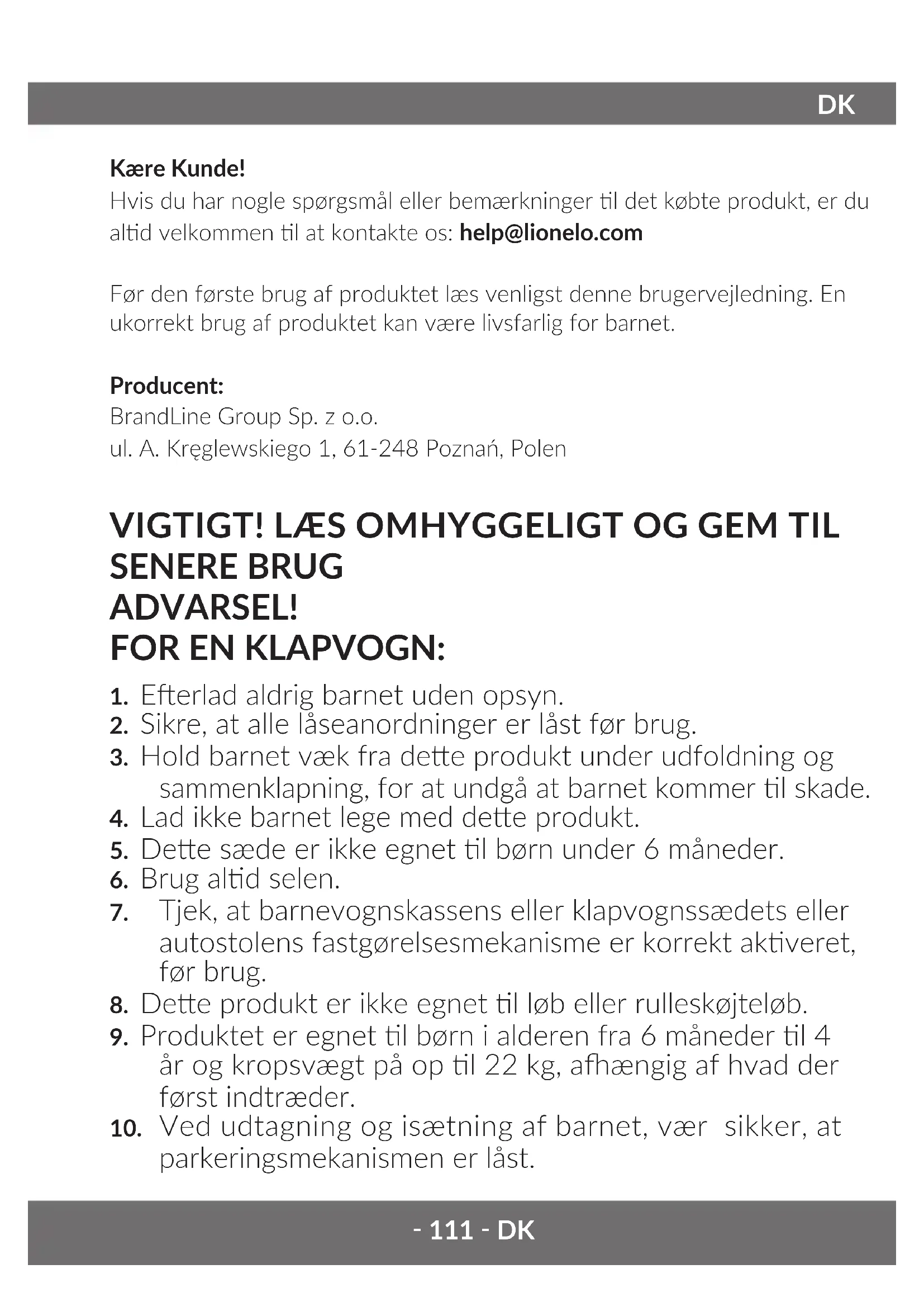 Kære Kunde! Hvis du har nogle spørgsmål eller bemærkninger l det købte produkt, er du ald velkommen l at kontakte os: help@lionelo.com Før den første brug af produktet læs venligst denne brugervejledning. En ukorrekt brug af produktet kan være livsfarlig for barnet. Producent: BrandLine Group Sp. z o.o. ul. A. Kręglewskiego 1, 61-248 Poznań, Polen VIGTIGT! LÆS OMHYGGELIGT OG GEM TIL SENERE BRUG ADVARSEL! FOR EN KLAPVOGN: