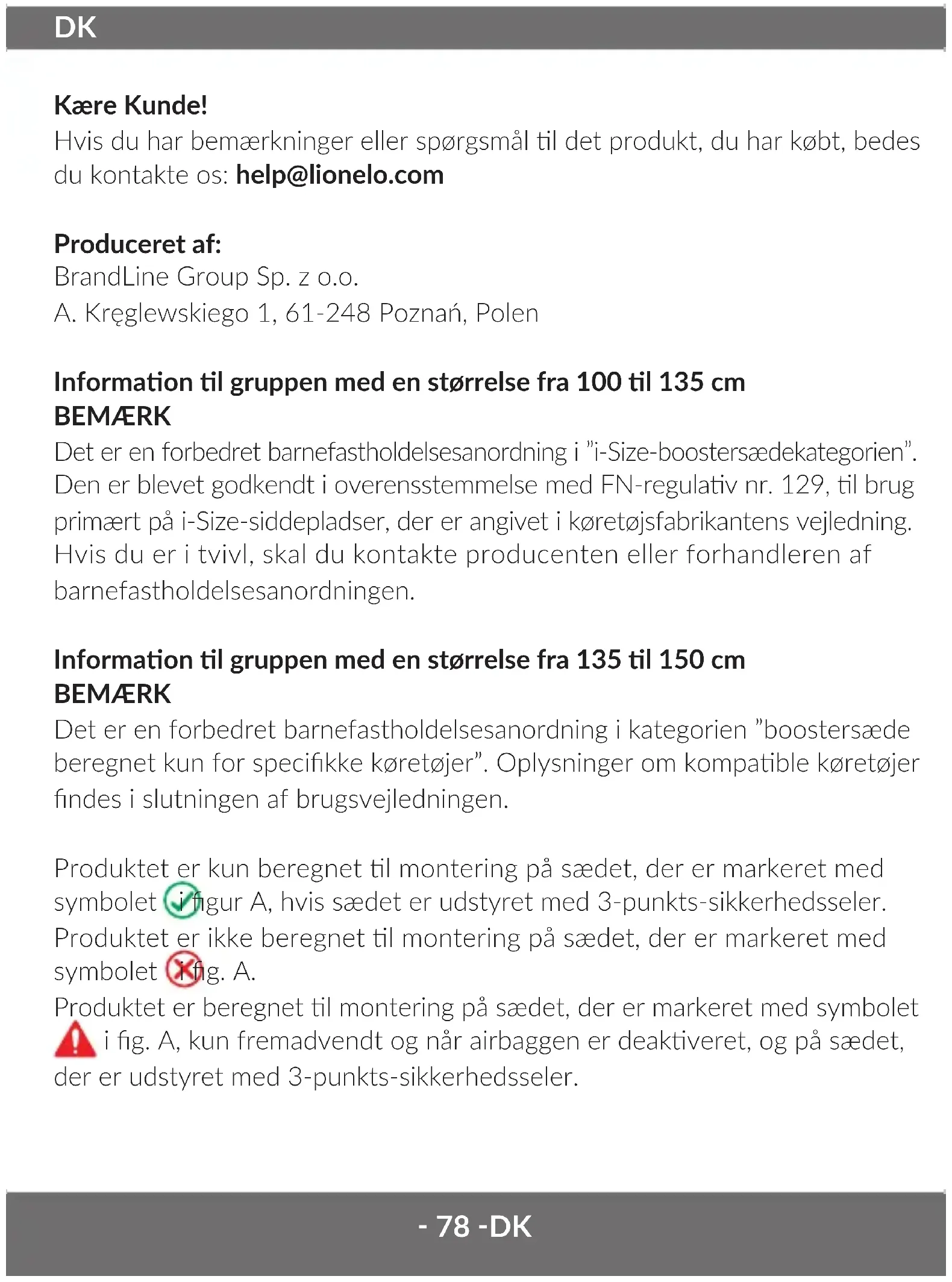 Kære Kunde! Hvis du har bemærkninger eller spørgsmål l det produkt, du har købt, bedes du kontakte os: help@lionelo.com Produceret af: BrandLine Group Sp. z o.o. A. Kręglewskiego 1, 61-248 Poznań, Polen Informaon l gruppen med en størrelse fra 100 l 135 cm BEMÆRK Det er en forbedret barnefastholdelsesanordning i ”i-Size-boostersædekategorien”. Den er blevet godkendt i overensstemmelse med FN-regulav nr. 129, l brug primært på i-Size-siddepladser, der er angivet i køretøjsfabrikantens vejledning. Hvis du er i tvivl, skal du kontakte producenten eller forhandleren af barnefastholdelsesanordningen. Informaon l gruppen med en størrelse fra 135 l 150 cm BEMÆRK Det er en forbedret barnefastholdelsesanordning i kategorien ”boostersæde beregnet kun for specikke køretøjer”. Oplysninger om kompable køretøjer ndes i slutningen af brugsvejledningen. Produktet er kun beregnet l montering på sædet, der er markeret med symbolet i gur A, hvis sædet er udstyret med 3-punkts-sikkerhedsseler. Produktet er ikke beregnet l montering på sædet, der er markeret med symbolet i g. A. Produktet er beregnet l montering på sædet, der er markeret med symbolet i g. A, kun fremadvendt og når airbaggen er deakveret, og på sædet, der er udstyret med 3-punkts-sikkerhedsseler.‑ 79 ‑ DK ADVARSLER: