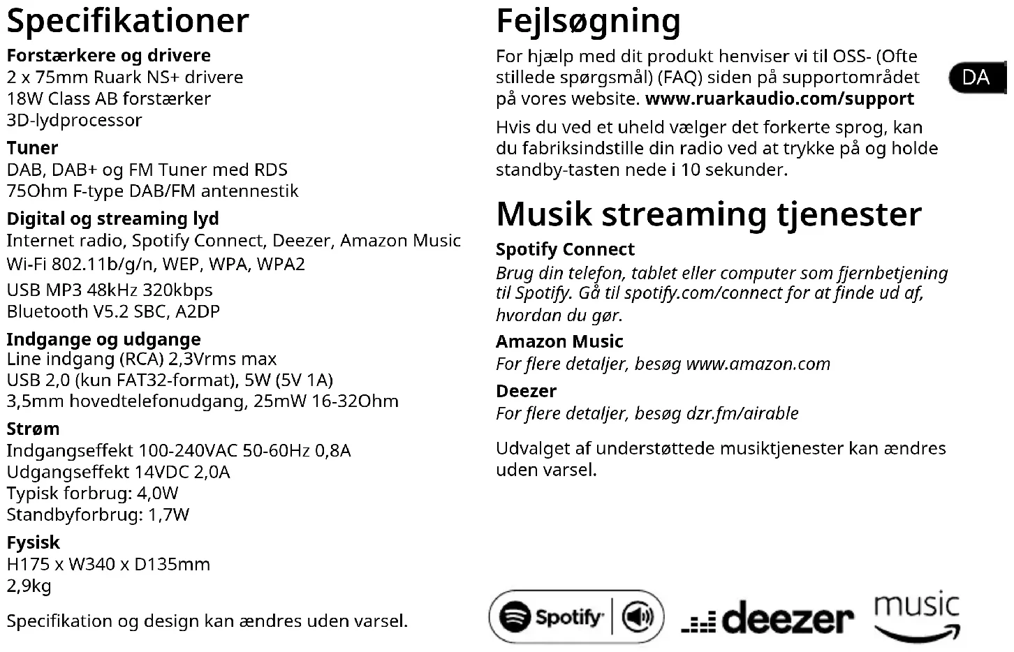 Specikationer Forstærkere og drivere 2 x 75mm Ruark NS+ drivere 18W Class AB forstærker 3D-lydprocessor Tuner DAB, DAB+ og FM Tuner med RDS 75Ohm F-type DAB/FM antennestik Digital og streaming lyd Internet radio, Spotify Connect, Deezer, Amazon Music Wi-Fi 802.11b/g/n, WEP, WPA, WPA2 USB MP3 48kHz 320kbps Bluetooth V5.2 SBC, A2DP Indgange og udgange Line indgang (RCA) 2,3Vrms max USB 2,0 (kun FAT32-format), 5W (5V 1A) 3,5mm hovedtelefonudgang, 25mW 16-32Ohm Strøm Indgangseekt 100-240VAC 50-60Hz 0,8A Udgangseekt 14VDC 2,0A Typisk forbrug: 4,0W Standbyforbrug: 1,7W Fysisk H175 x W340 x D135mm 2,9kg Specikation og design kan ændres uden varsel. Fejlsøgning For hjælp med dit produkt henviser vi til OSS- (Ofte stillede spørgsmål) (FAQ) siden på supportområdet på vores website. www.ruarkaudio.com/support Hvis du ved et uheld vælger det forkerte sprog, kan du fabriksindstille din radio ved at trykke på og holde standby-tasten nede i 10 sekunder. Musik streaming tjenester Spotify Connect Brug din telefon, tablet eller computer som fjernbetjening til Spotify. Gå til spotify.com/connect for at nde ud af, hvordan du gør. Amazon Music For ere detaljer, besøg www.amazon.com Deezer For ere detaljer, besøg dzr.fm/airable Udvalget af understøttede musiktjenester kan ændres uden varsel.Fællesfunktioner Tænd og gå i standby Tryk på STANDBY for at tænde for radioen. Tryk igen for at skifte til standby. Spiller nu-skærme Medmindre en indstilling bliver justeret, vil skærmen se ud som eksemplet nedenfor.