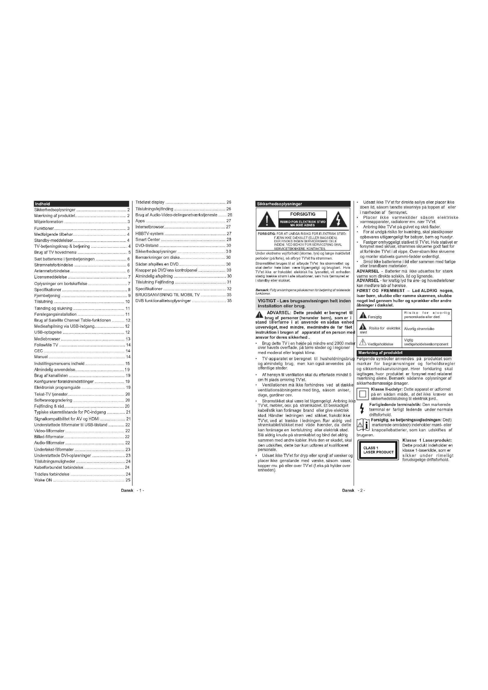 DVB funktionalitetsoplysninger .............................. 35 Dansk - 2 - Sikkerhedsoplysninger FORSIGTIG RISIKO FOR ELEKTRISK STØDMÅ IKKE ÅBNESFORSIGTIG: FOR AT UNDGÅ RISIKO FOR ELEKTRISK STØD: FJERN IKKE DÆKSLET (ELLER BAGSIDEN). DER FINDES INGEN SERVICÉRBARE DELE INDENI. VED BEHOV FOR SERVICERING SKAL SERVICETEKNIKERE. KONTAKTES.Bemærk: Følg anvisningerne på skærmen for betjening af relaterede funktioner. Under ekstreme vejrforhold (storme, lyn) og lange inaktivitet perioder (på ferie), så afbryd TV'et fra strømmen. Strømstikket bruges til at afbryde TV'et fra strømnettet og skal derfor hele tiden være tilgængeligt og brugbart. Hvis TV'et ikke er frakoblet elektrisk fra lysnettet, vil enheden stadig trække strøm i alle situationer, selv hvis fjernsynet er i standby eller slukket. VIGTIGT - Læs brugsanvisningen helt inden installation eller brug. ADVARSEL: Dette produkt er beregnet til brug af personer (herunder børn), som er i stand til/erfarne i at anvende en sådan enhed uovervåget, med mindre, medmindre de far fået instruktion i brugen af apparatet af en person med ansvar for deres sikkerhed . Brug dette TV i en højde på mindre end 2000 meter over havets overflade, på tørre steder og i regioner med moderat eller tropisk klima. TV-apparatet er beregnet til husholdningsbrug og almindelig brug, men kan også anvendes på offentlige steder. Af hensyn til ventilation skal du efterlade mindst 5 cm fri plads omkring TV'et. Ventilationen må ikke forhindres ved at dække ventilationsåbningerne med ting, såsom aviser, duge, gardiner osv. Strømstikket skal være let tilgængeligt. Anbring ikke TV'et, møbler, osv. på strømkablet. Et beskadiget kabel/stik kan forårsage brand eller give elektrisk stød. Håndter ledningen ved stikket, frakobl ikke TV'et, ved at trække i ledningen. Rør aldrig ved strømkablet/stikket med våde hænder, da dette kan forårsage en kortslutning eller elektrisk stød. Slå aldrig knude på strømkablet og bind det aldrig sammen med andre kabler. Hvis den er skadet, skal den udskiftes, dette bør kun udføres af kvalificeret personale. Udsæt ikke TV’et for dryp eller sprøjt af væsker og placer ikke genstande med væske, såsom vaser, kopper mv. på eller over TV’et (f.eks på hylder over enheden). Udsæt ikke TV’et for direkte sollys eller placer ikke åben ild, såsom tændte stearinlys på toppen af eller i nærheden af fjernsynet. Placer ikke varmekilder såsom elektriske varmeapparater, radiatorer mv. nær TV'et. Anbring ikke TV'et på gulvet og skrå flader. For at undgå risiko for kvælning, skal plastikposer opbevares utilgængeligt for babyer, børn og husdyr. Fastgør omhyggeligt stativet til TV'et. Hvis stativet er forsynet med skruer, strammes skruerne godt fast for at forhindre TV'et i at vippe. Over-stram ikke skruerne og monter stativets gummi-fødder ordentligt. Smid ikke batterierne i ild eller sammen med farlige eller brandbare materialer. ADVARSEL - Batterier må ikke udsættes for stærk varme som direkte solskin, ild og lignende. ADVARSEL - for kraftig lyd fra øre- og hovedtelefoner kan medføre tab af hørelse. FØRST OG FREMMEST – Lad ALDRIG nogen, især børn, skubbe eller ramme skærmen, skubbe noget ind gennem huller og sprækker eller andre åbninger i dækslet. Forsigtig Risiko for alvorlig personskade eller død Risiko for elektrisk stød Alvorlig strømrisiko Vedligeholdelse Vigtig vedligeholdelseskomponent Mærkning af produktet Følgende symboler anvendes på produktet som markør for begrænsninger og forholdsregler og sikkerhedsanvisninger. Hver forklaring skal iagttages, hvor produktet er forsynet med relateret mærkning alene. Bemærk sådanne oplysninger af sikkerhedsmæssige årsager. Klasse II-udstyr: Dette apparat er udformet på en sådan måde, at det ikke kræver en sikkerhedstilslutning til elektrisk jord.. Farligledende terminalstik: Den markerede terminal er farligt ledende under normale driftsforhold.