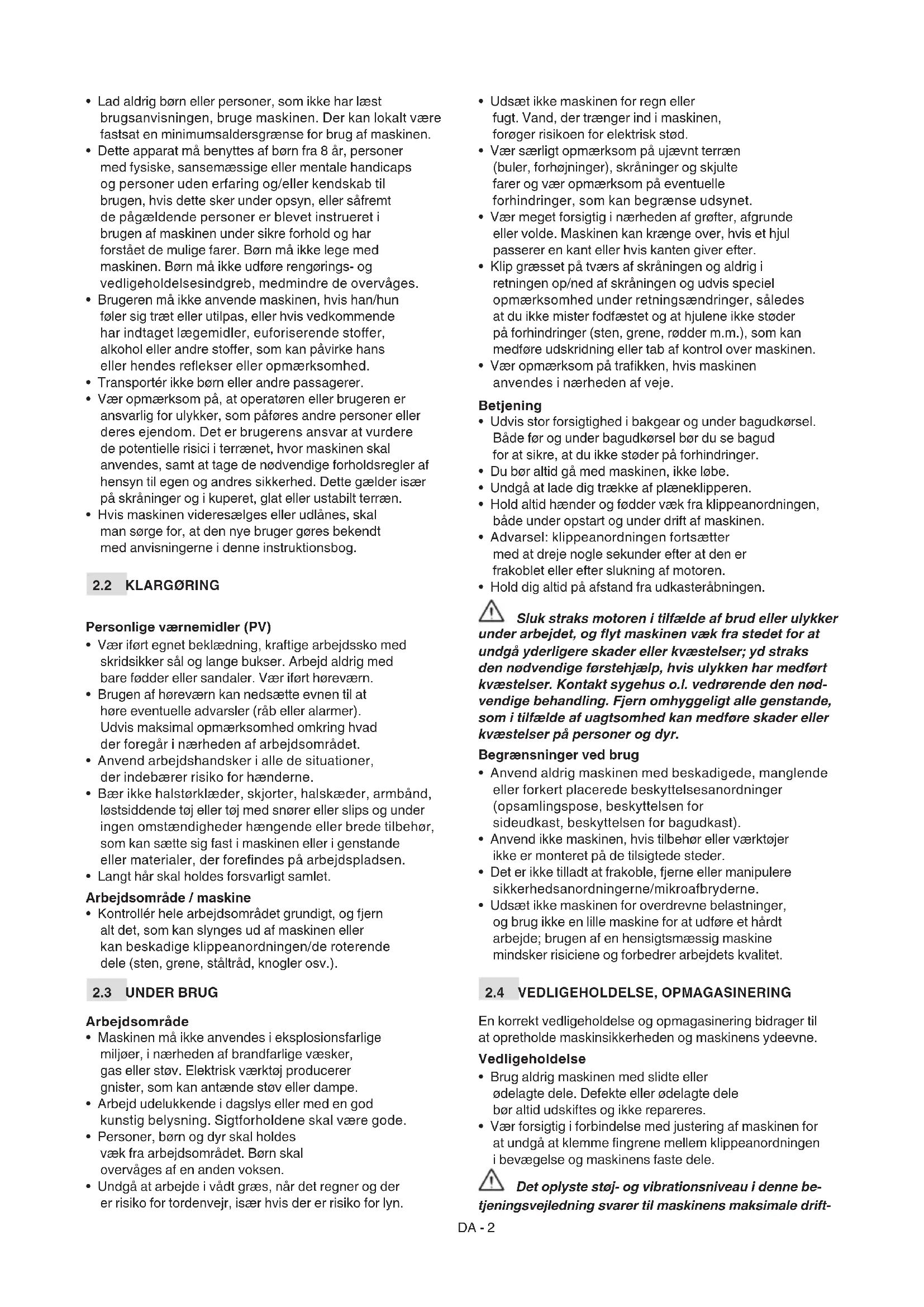 - Vær opmærksom på, at operatøren eller brugeren er ansvarlig for ulykker, som påføres andre personer eller deres ejendom. Det er brugerens ansvar at vurdere de potentielle risici i terrænet, hvor maskinen skal anvendes, samt at tage de nødvendige forholdsregler af hensyn til egen og andres sikkerhed. Dette gælder især på skråninger og i kuperet, glat eller ustabilt terræn.