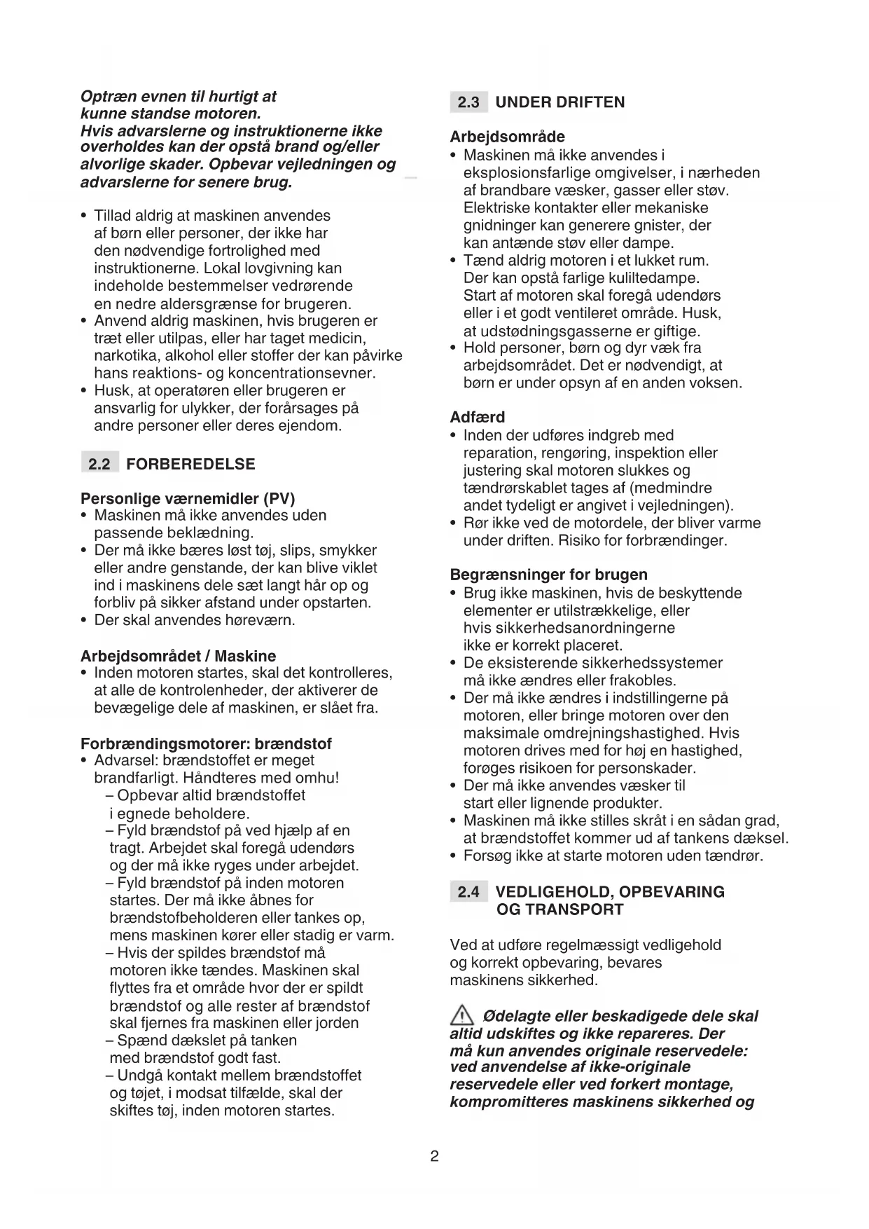 De sikkerhedsregler der skal følges under arbejdet med vedligehold er beskrevet i afs. 2.4. Alle indgreb med kontrol og vedligehold skal udføres med standset maskine og slukket motor. Frakobl tændrøret og læs den specikke vejledning, inden der udføres indgreb med vedligehold eller rengøring. Bær passende tøj, handsker og beskyttelsesbriller, inden der udføres indgreb med vedligehold.