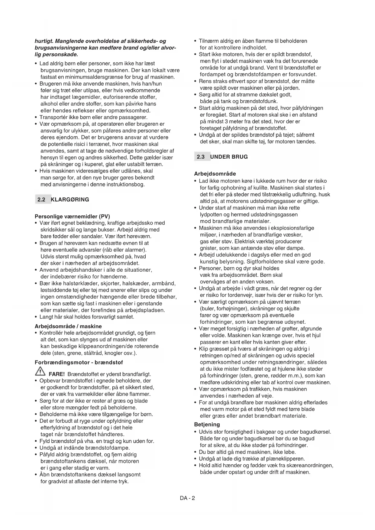 - Kontrollér hele arbejdsområdet grundigt, og fjern alt det, som kan slynges ud af maskinen eller kan beskadige klippeanordningen/de roterende dele (sten, grene, ståltråd, knogler osv.). Forbrændingsmotor - brændstof FARE! Brændstoet er yderst brandfarligt.