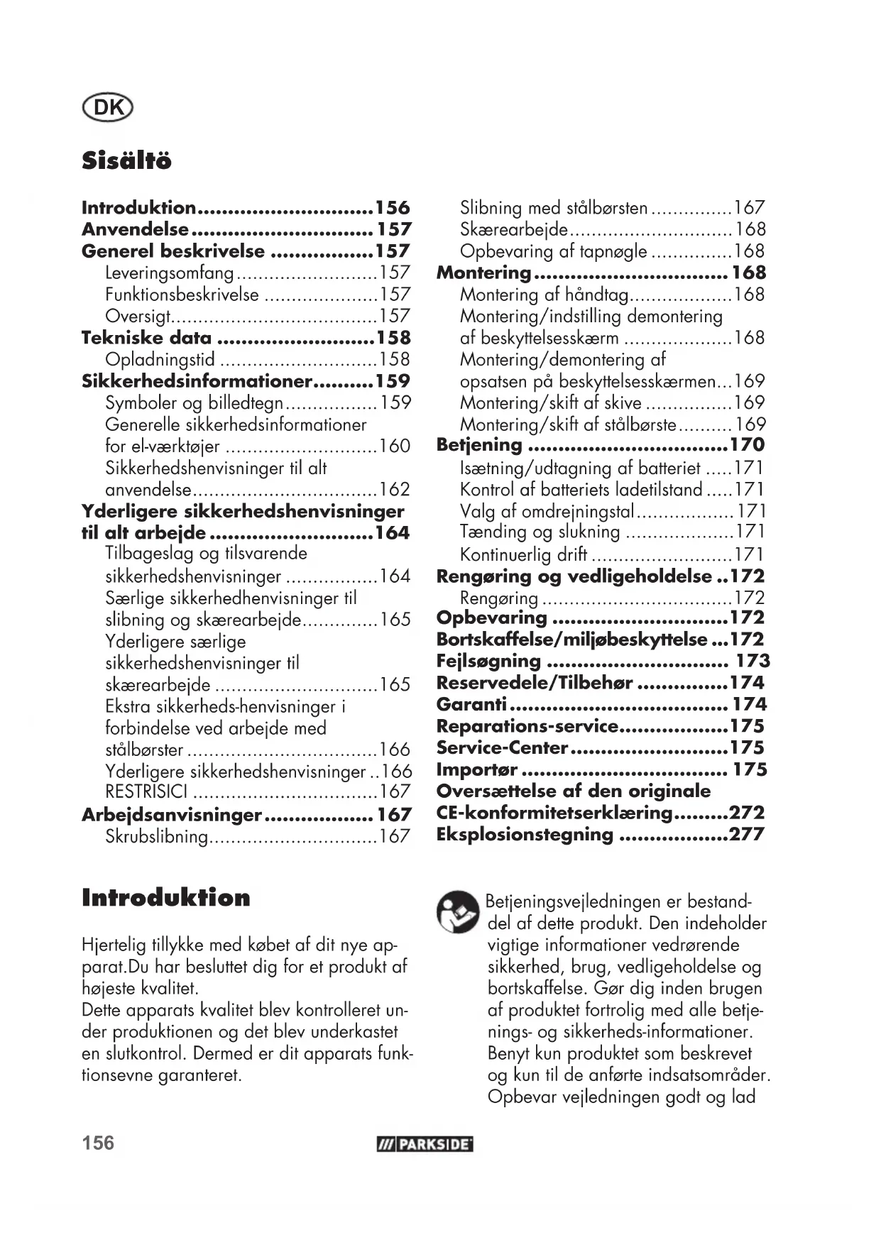 - Introduktion Hjertelig tillykke med købet af dit nye ap- parat.Du har besluttet dig for et produkt af højeste kvalitet. Dette apparats kvalitet blev kontrolleret un- der produktionen og det blev underkastet en slutkontrol. Dermed er dit apparats funk- tionsevne garanteret. Betjeningsvejledningen er bestand- del af dette produkt. Den indeholder vigtige informationer vedrørende sikkerhed, brug, vedligeholdelse og bortskaffelse. Gør dig inden brugen af produktet fortrolig med alle betje- nings- og sikkerheds-informationer. Benyt kun produktet som beskrevet og kun til de anførte indsatsområder. Opbevar vejledningen godt og lad Sisältö Introduktion p. 156