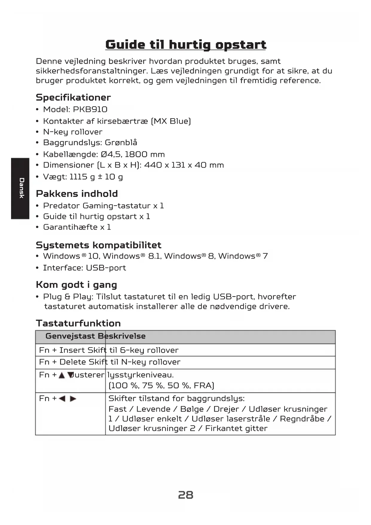 - Plug & Play: Tilslut tastaturet til en ledig USB-port, hvorefter tastaturet automatisk installerer alle de nødvendige drivere. Tastaturfunktion Genvejstast Beskrivelse Fn + Insert Skift til 6-key rollover Fn + Delete Skift til N-key rollover Fn + Justerer lysstyrkeniveau. (100 %, 75 %, 50 %, FRA) Fn + Skifter tilstand for baggrundslys: Fast / Levende / Bølge / Drejer / Udløser krusninger 1 / Udløser enkelt / Udløser laserstråle / Regndråbe / Udløser krusninger 2 / Firkantet gitter29 Dansk Genvejstast Beskrivelse Fn + Home Optager øjeblikkeligt makro Trin 1: Tryk på Fn + F6. Aktiver Windows tastaturlås. Trin 2: Tryk på Fn + Home, LED blinker. Trin 3: Tildel en tast for at gemme makroen, LED'en blinker hurtigere. Trin 4: Tryk på tasten i makrolisten. Trin 5: Tryk på Fn + Home, afslut øjeblikkelig optagelse af makro. Optagelsen afbrydes, hvis der ikke udføres en handling inden for 20 sek. Vejledning i korrekt brug Visse undersøgelser har vist, at lange perioder med gentagne bevægelser, dårlig planlægning ved opsætning af produktet, dårlig kropsholdning og dårlige arbejdsvaner kan være tilknyttet fysisk ubehag og skader på nerver, sener og muskler. Nedenfor er nogle vejledninger i, hvordan du optimerer brugen og undgår personskader.