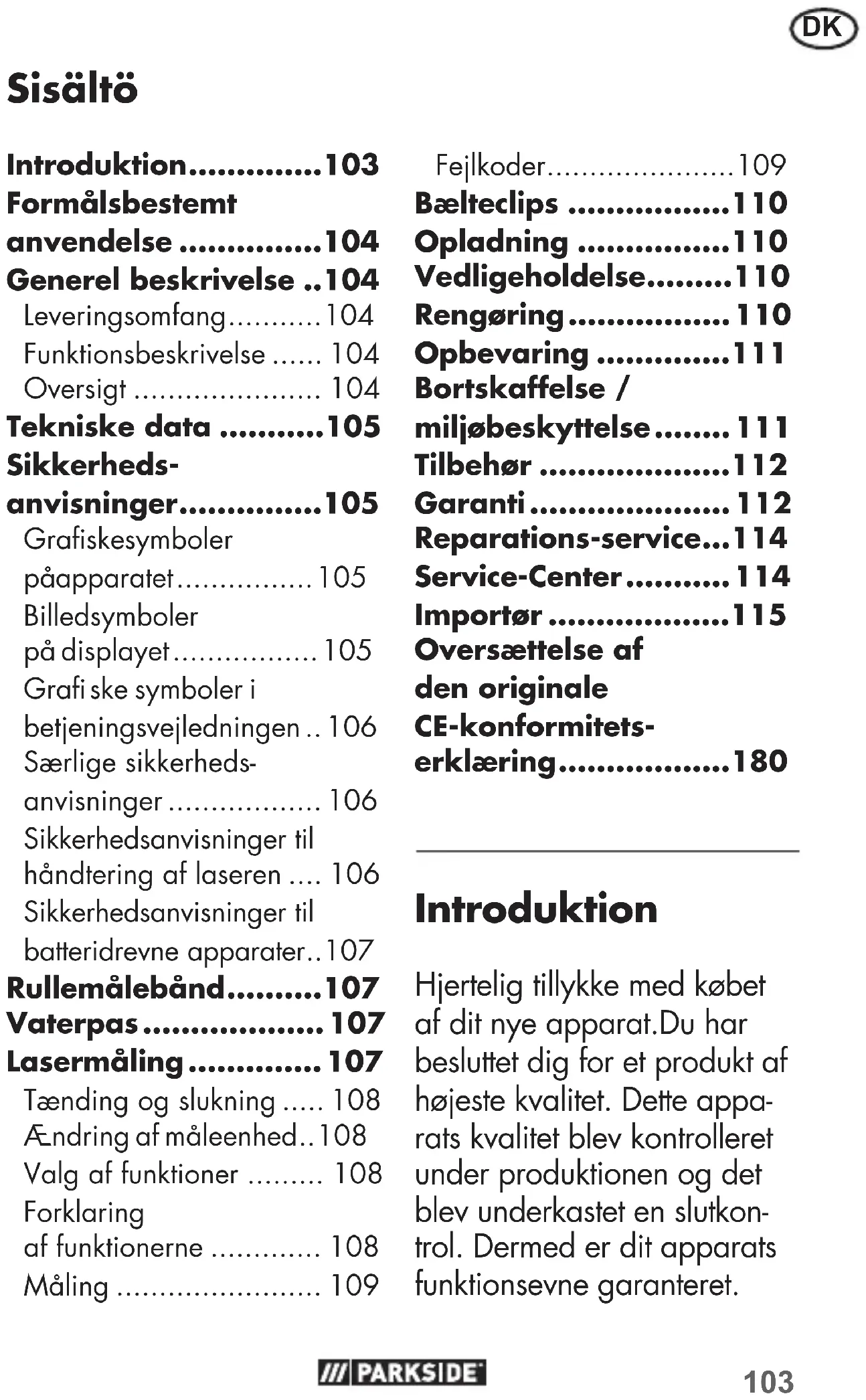 Betjeningsvejledningen er bestanddel af dette produkt. Den indehol- der vigtige informationer vedrørende sikkerhed, brug, vedligeholdelse og bortskaf- felse. Gør dig inden brugen af produktet fortrolig med alle betjenings- og sikkerheds-in- formationer. Benyt kun produktet som beskrevet og kun til de anførte indsatsom- råder. Opbevar vejledningen godt og lad alle dokumenter følge med ved videregivelse af produktet til tredje. Formålsbestemt anvendelse Målebåndet med laser og vaterpas er beregnet til afstandsmåling. Apparatet må kun anven- des af voksne. Brugeren er ansvarlig for ulykker eller skader på andre menne- sker eller disses ejendom. Producenten er ikke ansvar- lig for skader, som skyldes anvendelse, der ikke er i overensstemmelse med den formålsbestemte anvendelse, eller som skyldes forkert betjening. Dette apparat er ikke egnet til erhvervsmæssig brug. Ved erhvervsmæssig brug bortfalder garantien. Apparatet er udelukkende egnet til brug i tørre rum. Generel beskrivelse Illustrationerne ndes på udklapningssiden. Leveringsomfang Pak apparatet ud, og kontrollér, om leveringen er fuldstændig. - Laser-afstandsmåler med målebånd - USB-C-ladekabel - Betjeningsvejledning Bortskaf emballagen korrekt. Funktionsbeskrivelse Betjeningsdelenes funktioner beskrives i det følgende. Oversigt 1 Libelle 2 Display105