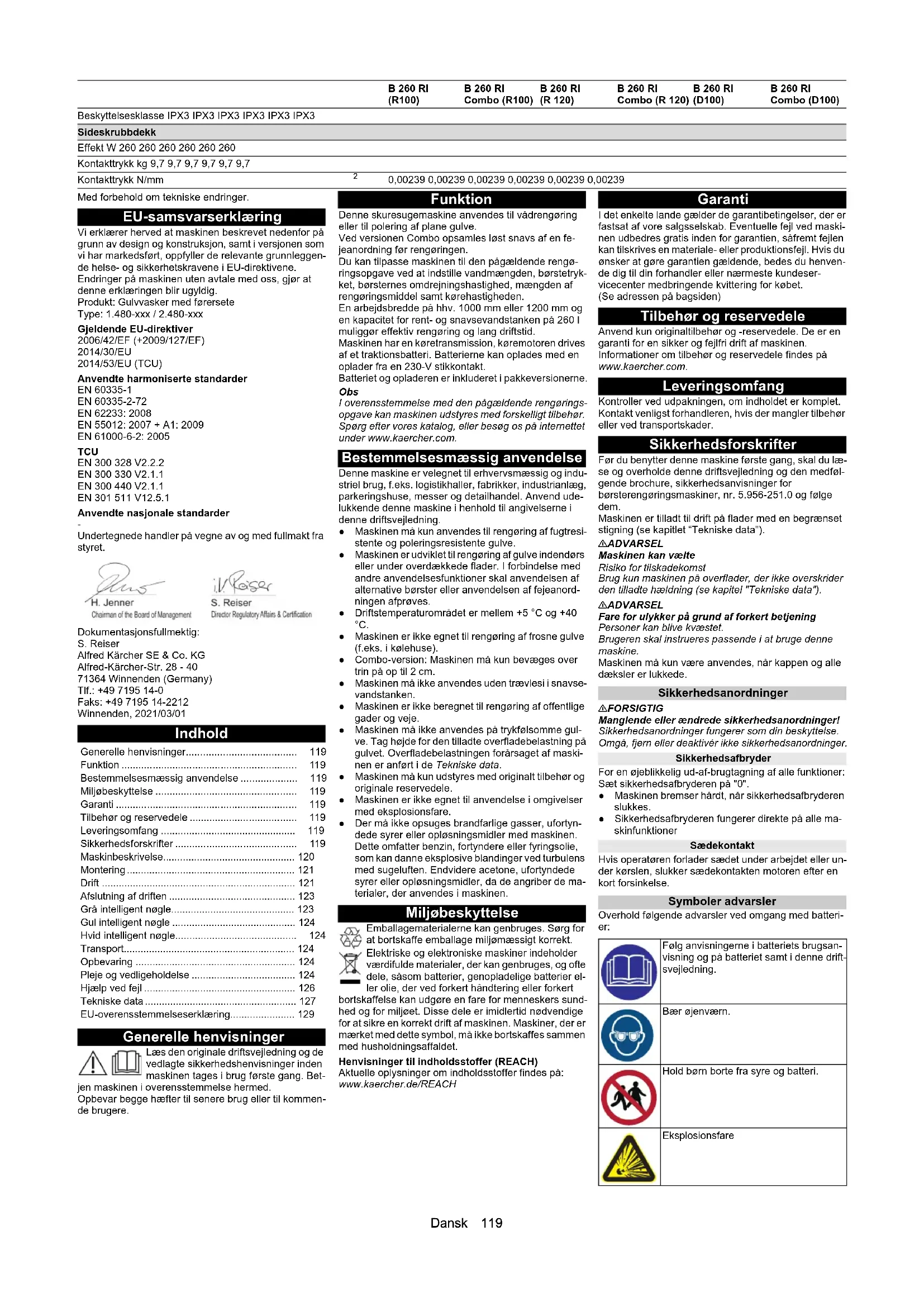 0,00239 0,00239 0,00239 0,00239 0,00239 0,00239 B 260 RI (R100) B 260 RI Combo (R100) B 260 RI (R 120) B 260 RI Combo (R 120) B 260 RI (D100) B 260 RI Combo (D100)Eesti 129 EU-overensstemmelseserklæring Hermed erklærer vi, at nedenstående maskine på grund af sin udformning og konstruktion i den udførelse, i hvil- ken den sælges af os, overholder EU-direktivernes re- levante, grundlæggende sikkerheds- og sundhedsmæssige krav. Hvis maskinen ændres uden aftale med os, mister denne attest sin gyldighed. Produkt: Gulvrenser maskine med førersæde Type: 1.480-xxx / 2.480-xxx Relevante EU-direktiver 2006/42/EF (+2009/127/EF) 2014/30/EU 2014/53/EU (TCU) Anvendte harmoniserede standarder EN 60335-1 EN 60335-2-72 EN 62233: 2008 EN 55012: 2007 + A1: 2009 EN 61000-6-2: 2005 TCU EN 300 328 V2.2.2 EN 300 330 V2.1.1 EN 300 440 V2.1.1 EN 301 511 V12.5.1 Anvendte nationale standarder